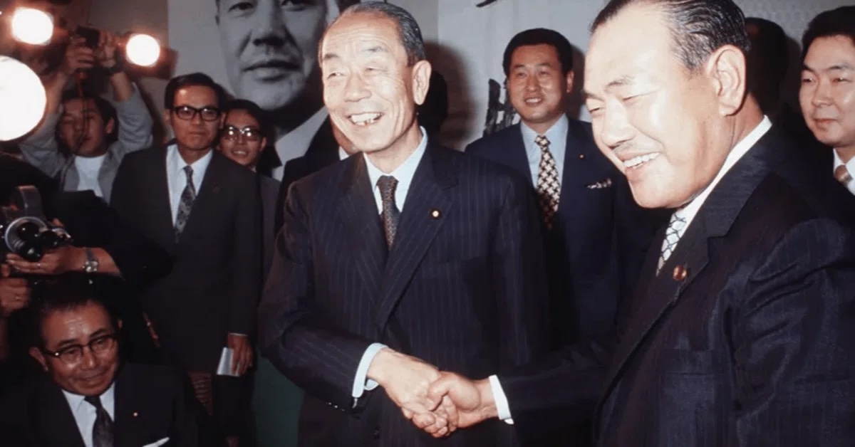 (ヘッダーは1972年の総裁選前、田中角栄と握手で好勝負を約す福田赳夫。ポストセブンより)