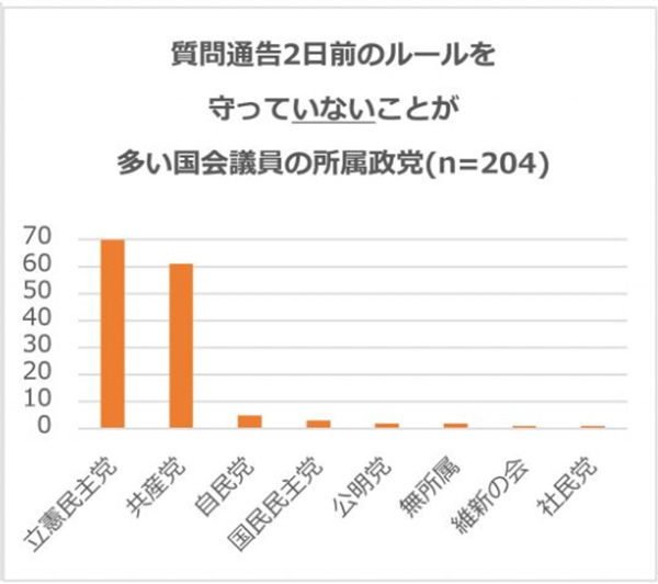 「2日前ルール」を守れない理由として、委員会の日程自体が権力闘争の一つになってしまっているという慣習が槍玉にあげられることがありますが、であればすべての党の質問通告が同程度に遅れても不思議はないはず。