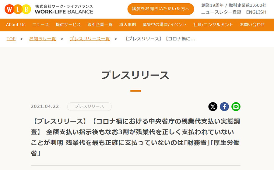 さて、最近多くの方が目にされているであろう「質問通告2日前のルールを守っていないことが多い政党」(画像1)の出典は、民間コンサルティング会社「ワーク・ライフバランス」社が2021年4月に発表した「コロナ禍における中央省庁の残業代支払い実態調査」(画像2)です。