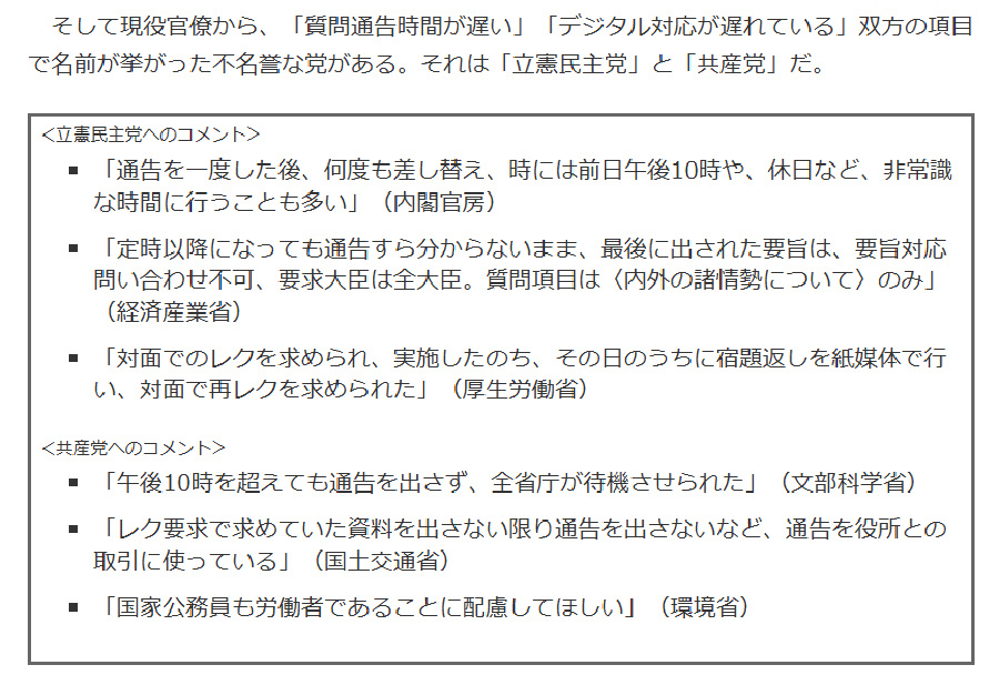 ちなみに、現役官僚から「質問通告2日前のルールを守っていないことが多い議員」として名前が多く挙がったのは、「森ゆうこ」「小西ひろゆき」「蓮舫」「福山哲郎」「枝野幸男」(以上立憲民主党)、「塩川鉄也」「山添拓」(以上共産党)の各氏でした。