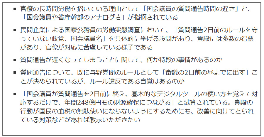 「国会議員の質問通告時間の遅さが、政党間での権力闘争の具となるばかりでなく、深夜にまで対応を迫られる官僚の疲弊と、莫大な残業代&タクシー代の支出に繋がり、ひいては過酷な労働環境を忌避して官僚のなり手不足の遠因にもなっている」ことについては、以前から問題視されていました。