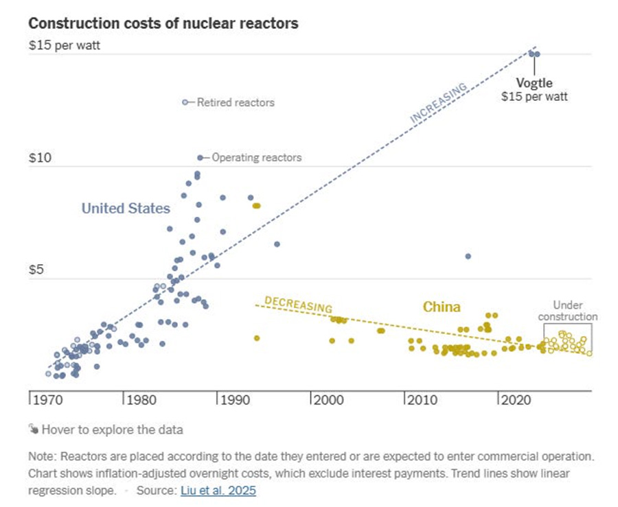 しかしそれ以上に、中国の原子力産業の合理性こそが、低コスト実現の鍵だったという。すなわち、ごく少数の原子炉タイプのみを建設し、それを繰り返し行うことで規模の経済を確立した。規制プロセスを合理化し、サプライチェーンを簡素化した。