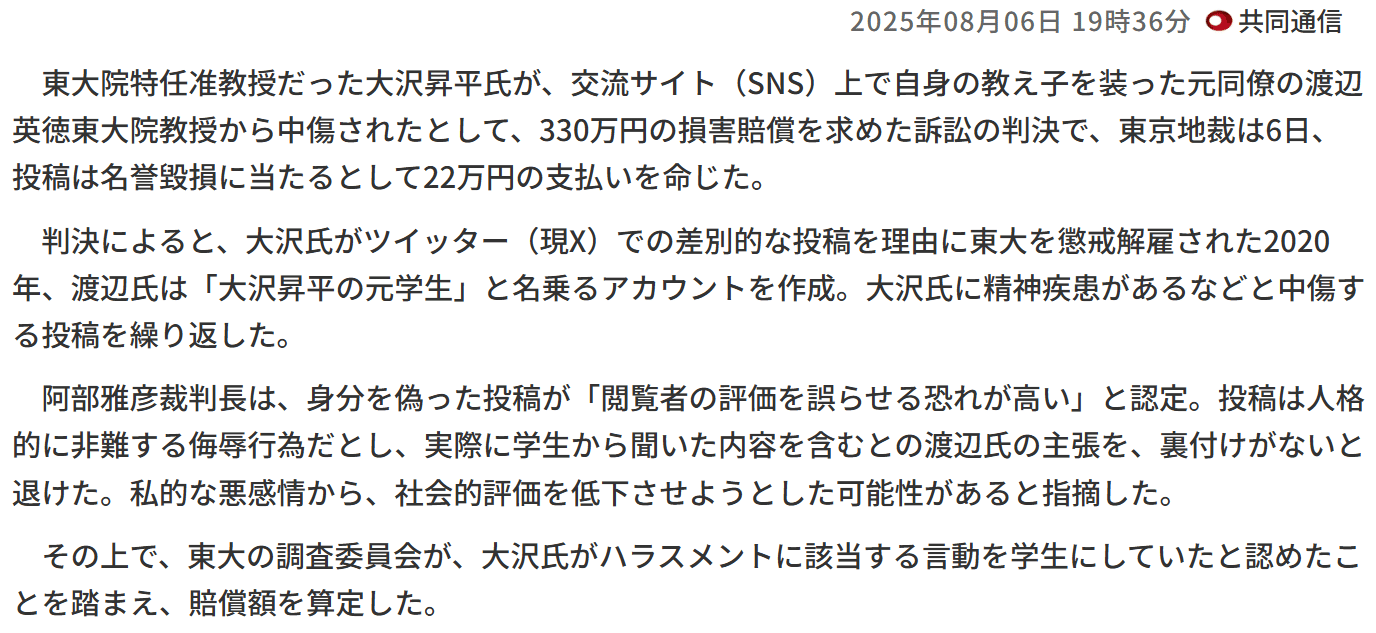 が、今年の8月に報じられた彼の行いは、衝撃的なものだった。共同通信のリンクが切れているので、アーカイブからスクショを貼る。