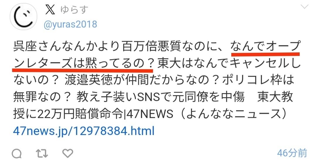 これまたAI絡みの研究者を(少なくとも)名乗っていた、大澤昇平氏がTwitterで中国人差別を公言して解雇されたのは有名な事件で、擁護の余地はないだろう。しかし、だからといって①他人の発言を捏造し、②精神疾患への差別言説で中傷することが、許されるはずはない。