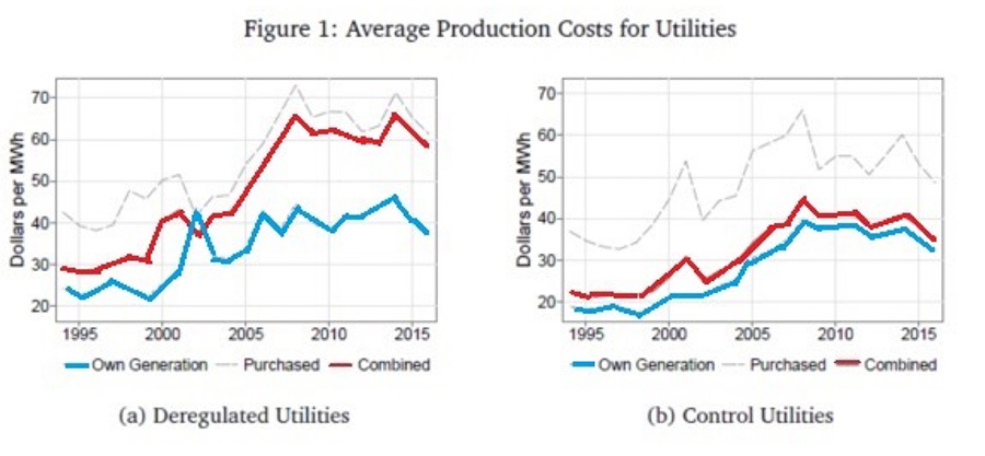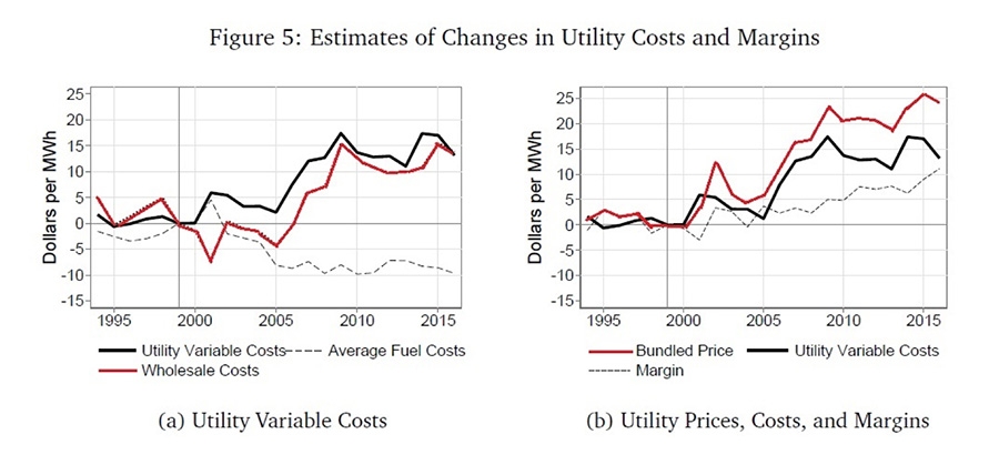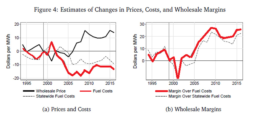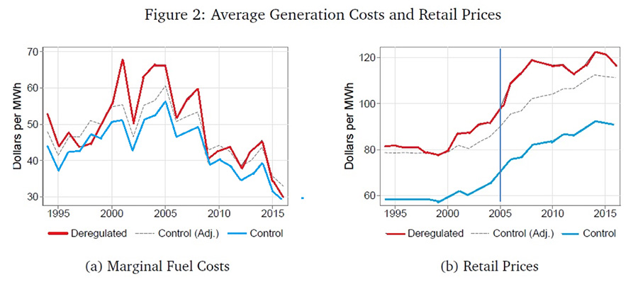 2005年、多くの州で小売価格上限規制が撤廃されて以降、限界燃料コストが下落したにもかかわらず、卸売価格・小売価格は上昇を続けた。規制維持州も同様の傾向を示すが、規制緩和州の方が限界燃料コストの下落幅が大きいにもかかわらず、小売価格の上昇幅も大きい。小売価格に注目すると、規制維持州の方が規制緩和州より10〜20%程度低く抑えられている。