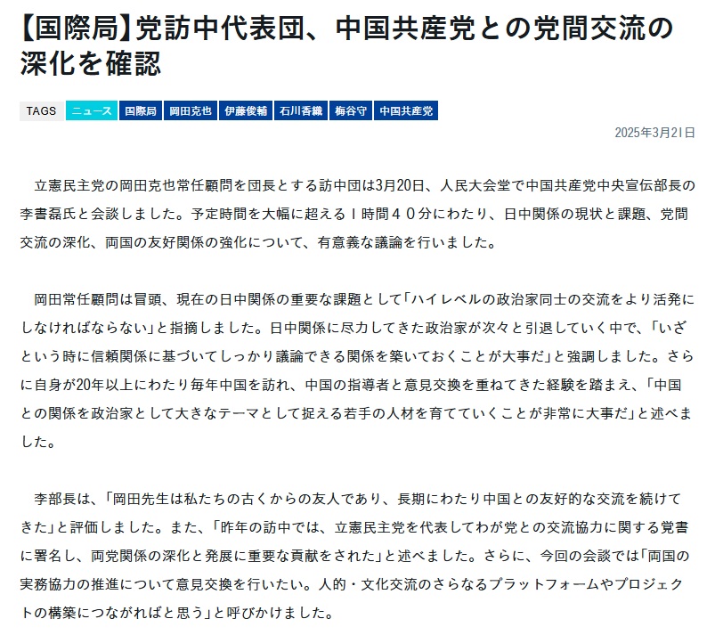 岡田氏は昨年8月にも訪中し、立憲民主党と共産党との党間交流に関する覚書を締結した。今回は覚書に基づき、20~23日までの日程で岡田氏ら4議員が訪中している。