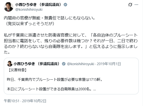 (発災以来ずっとそうだが)私が千葉県に派遣させた防衛省官僚に対して、「各自治体のブルーシート担当者に電話をして、残りの必要件数は幾つか?それが一日、二日で終わるのか?終わらないなら自衛隊を出します。」と伝えるように指示しました。
