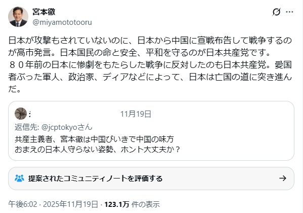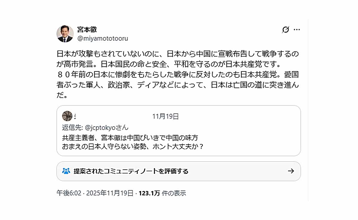 日本が攻撃もされていないのに、日本から中国に宣戦布告して戦争するのが高市発言。日本国民の命と安全、平和を守るのが日本共産党です。