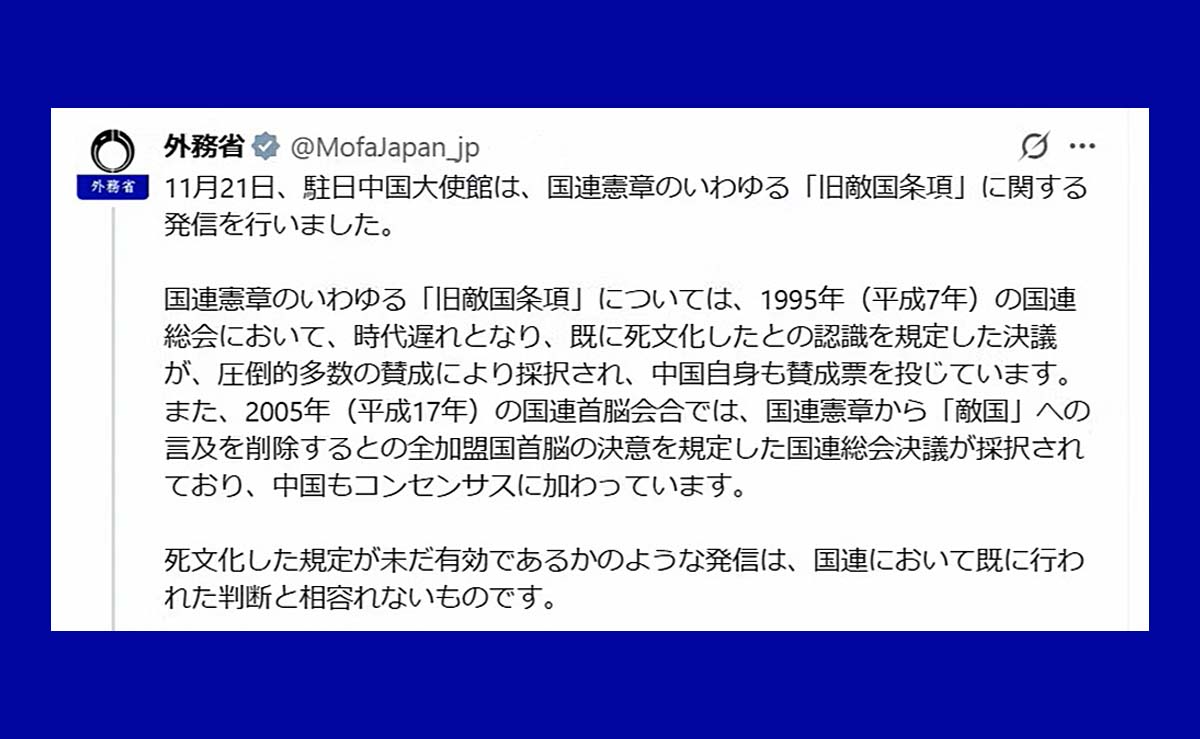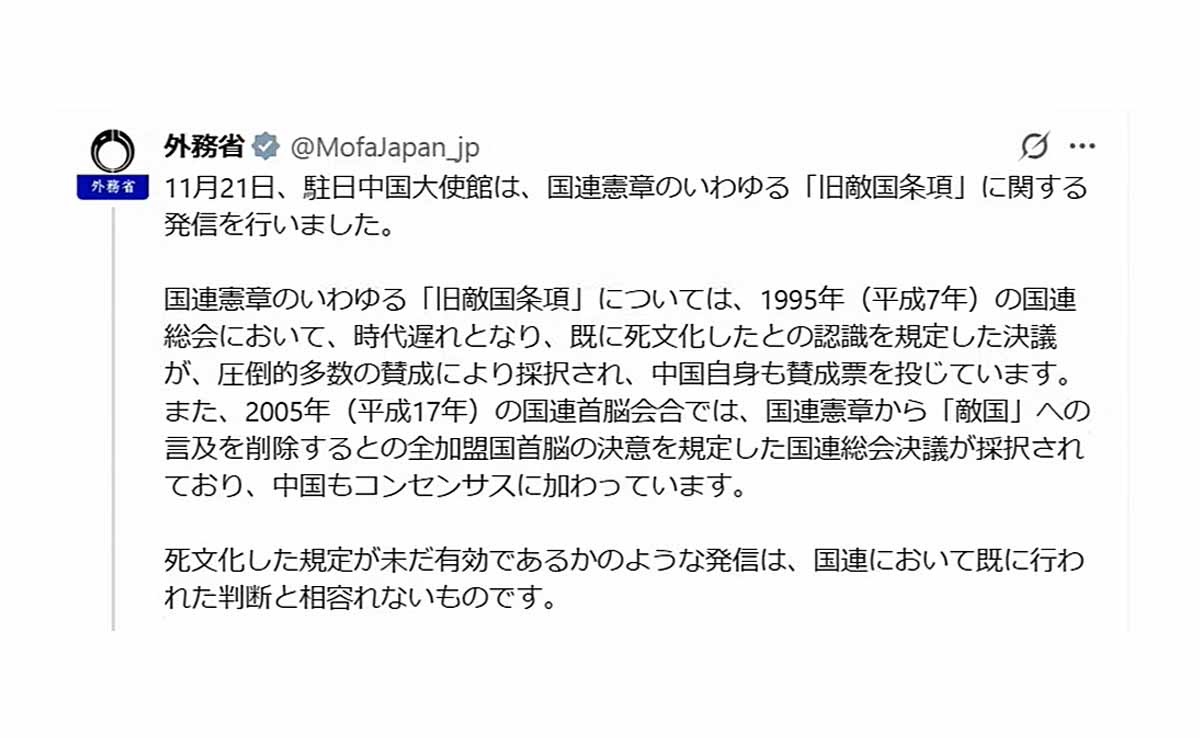 在日本中国大使館が国連憲章の「旧敵国条項」を根拠に、日本への武力行使が可能だと示唆する投稿を行った。これに対し、日本の外務省は23日、X(旧ツイッター)などで公式に反論した。