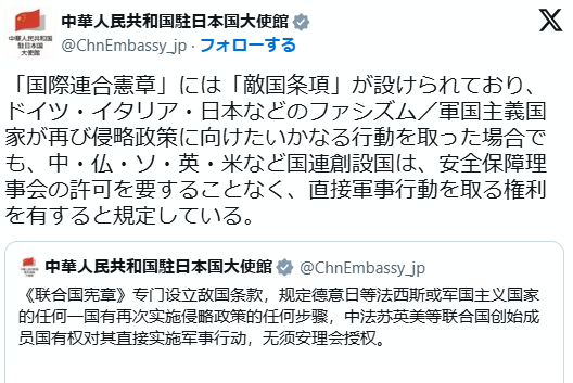 - 在日本中国大使館はXで、国連憲章の旧敵国条項を持ち出し、「安全保障理事会の許可なく日本に対して軍事行動が可能」と解釈できる内容を投稿した。