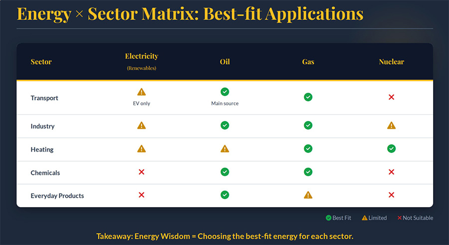 世界の一次エネルギーの構成比は依然として 80%以上が化石燃料 に支えられており、航空・海運・鉄鋼・化学・セメントなど、化石燃料なしでは成り立たない産業が世界経済の基盤を占める。この構造は今後しばらく変わらない。