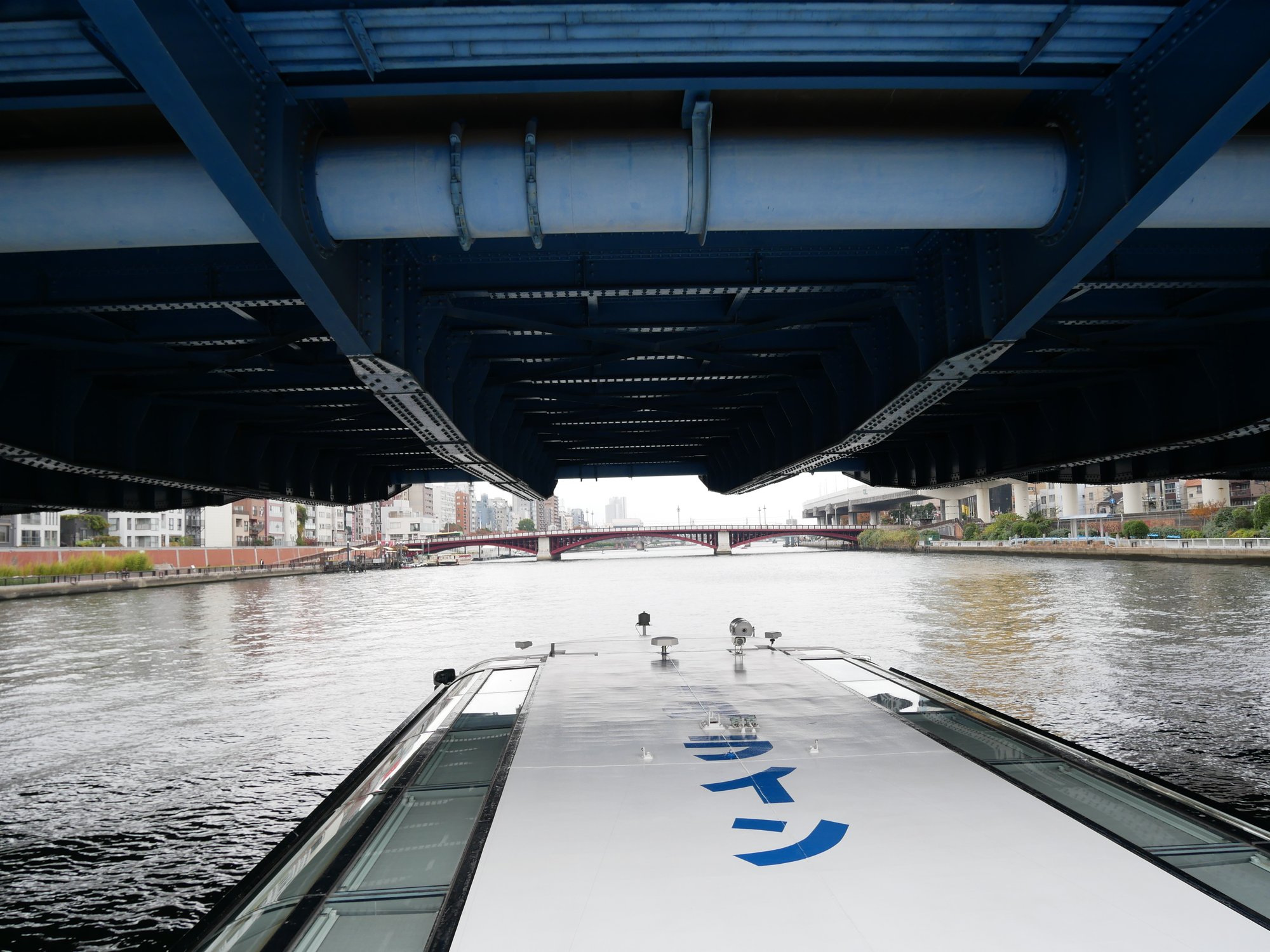 航行中、何度も橋をくぐります。今回は干潮時ということもあって橋と船の間にまだ余裕がありますが、満潮時の航行ではもっとすれすれのところを走るので、オープンデッキに登っている人はぶつからないようちょっと注意が必要です。