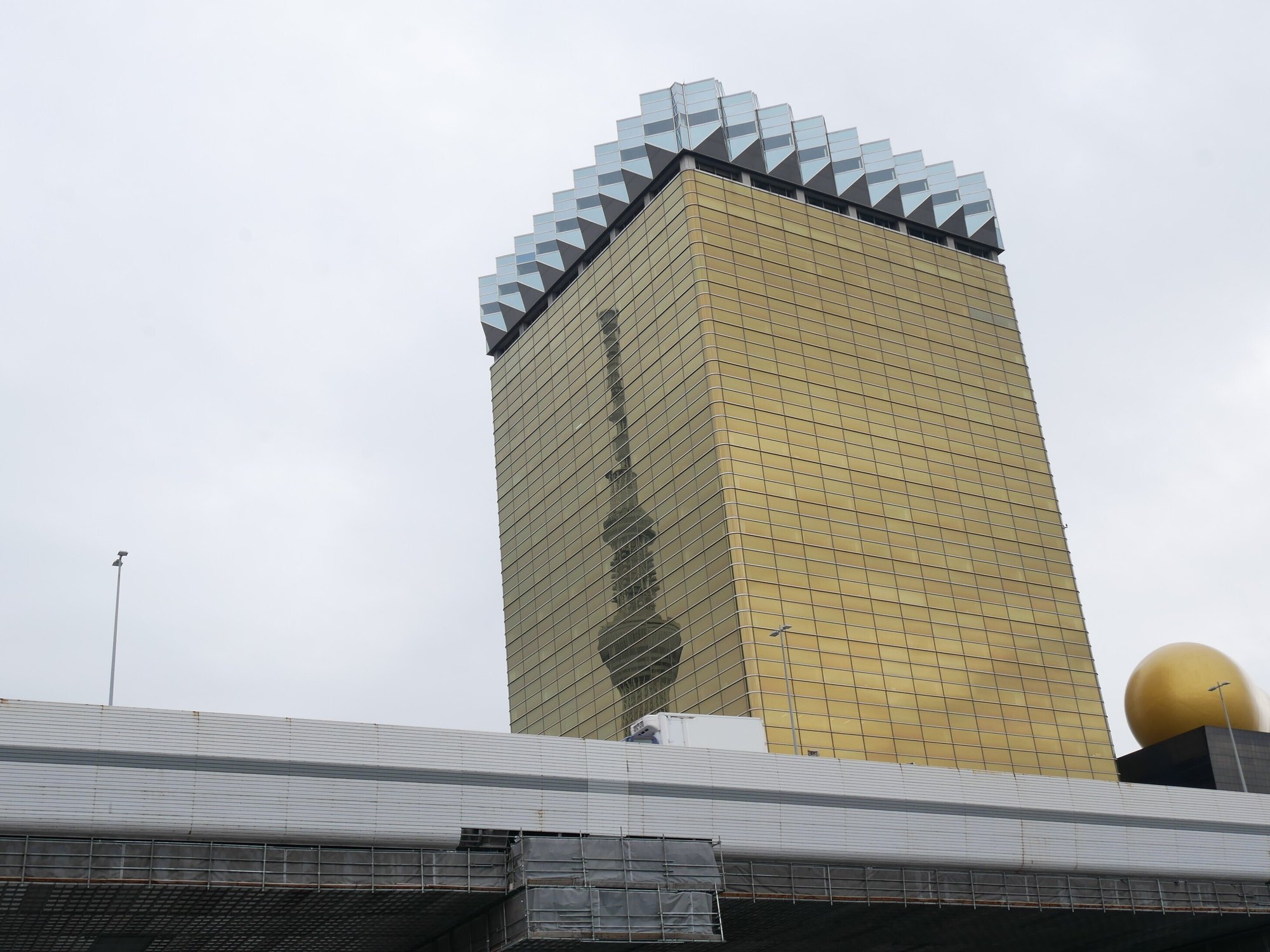 浅草に近づくにつれて、黄金に輝くビアジョッキのようなビルが見えてきます。これがアサヒビールの本社。手前の巨大なオブジェはアサヒビール社員の燃える心を現す「金の炎」です。実はこのビル、船からしか見ることができない景色を見せてくれることで有名です。