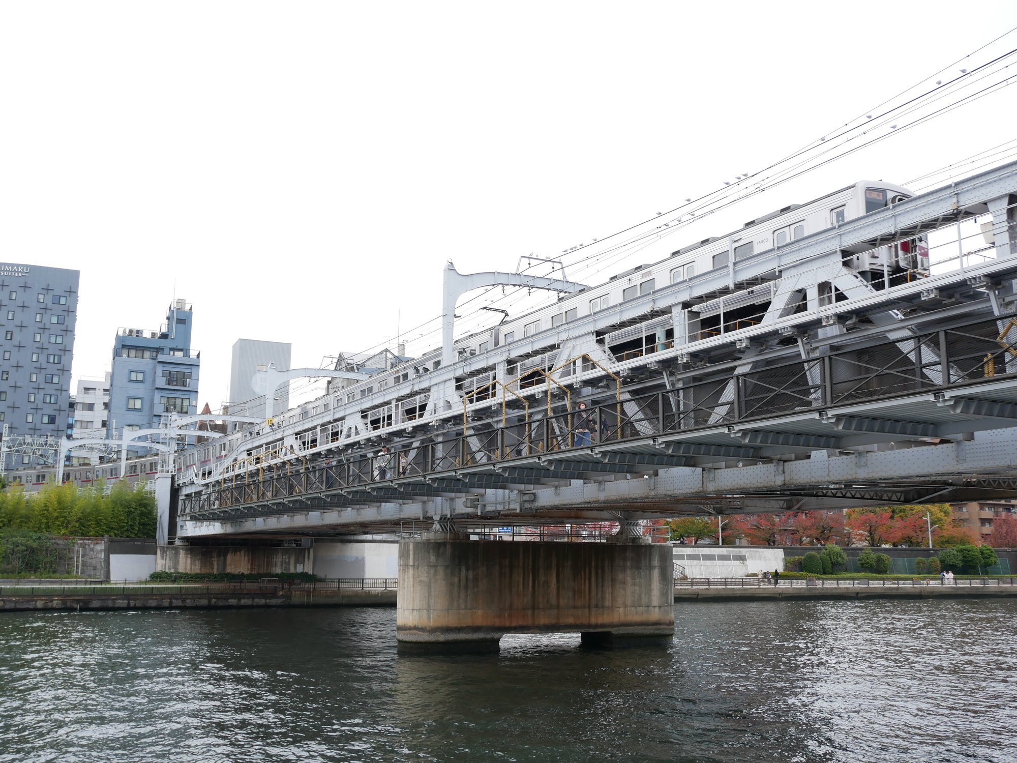 浅草が近づき、東武伊勢崎線の鉄橋、隅田川橋梁が近づいてきました。この先にある東武浅草駅は線路が左に急カーブした先にあります。そのため列車は速度を上げることができず、この橋の速度制限は15km/h。非常に遅いですがそれゆえ景色を存分に楽しむことができます。スカイツリーの夜景もゆっくり見られることでも評判です。
