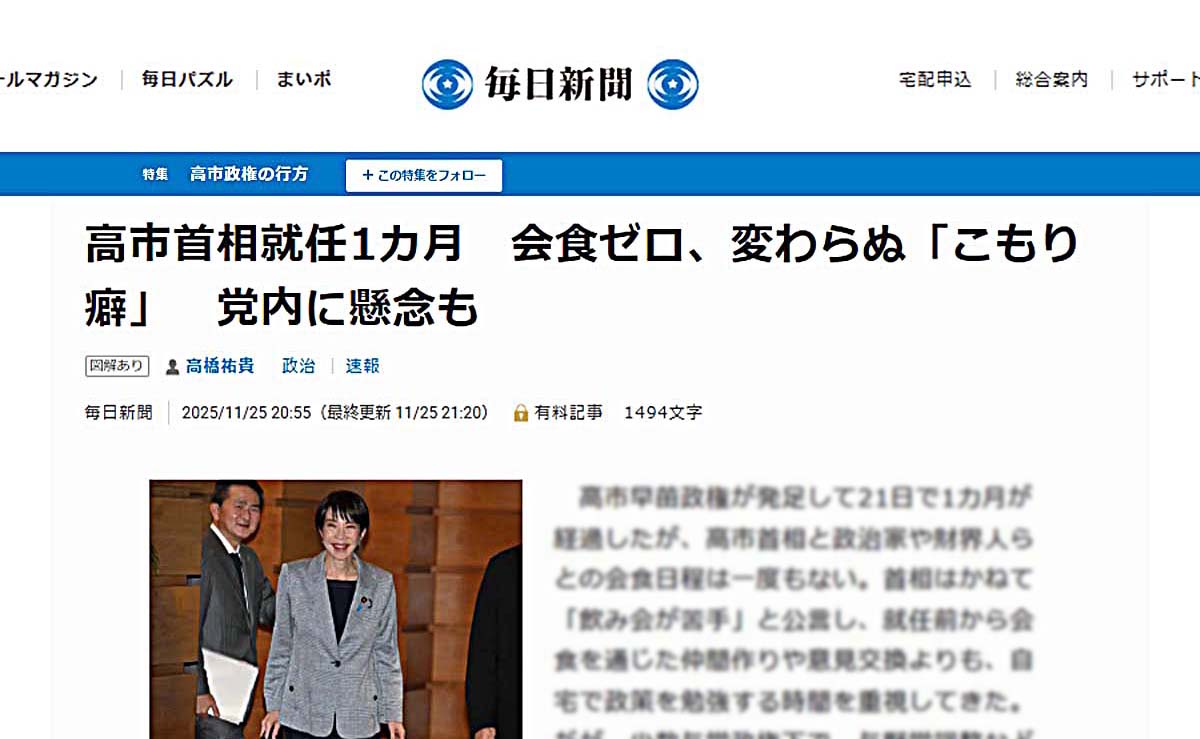 - 高市首相は就任1カ月となる11月21日時点で、政治家・財界人との会食がゼロ。毎日新聞の「首相日々」でも会食記録は一度も確認されていない。