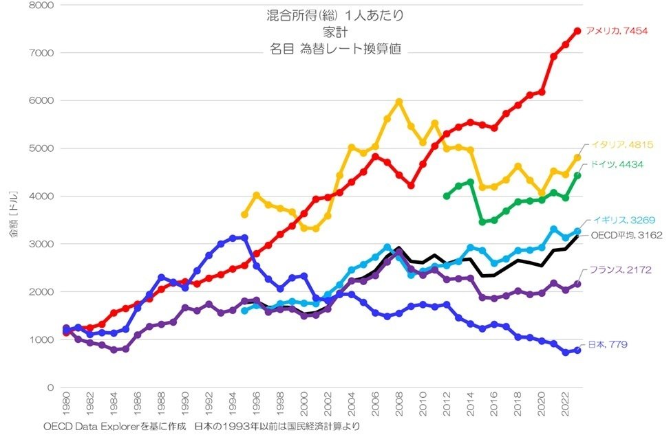 人口1人あたりの家計の混合所得(総)の推移を見ると、日本は1990年代にアメリカを上回る水準でしたが、その後は減少傾向が続き、近年では他国との差が大きく開いて低い水準となっている事が確認できます。