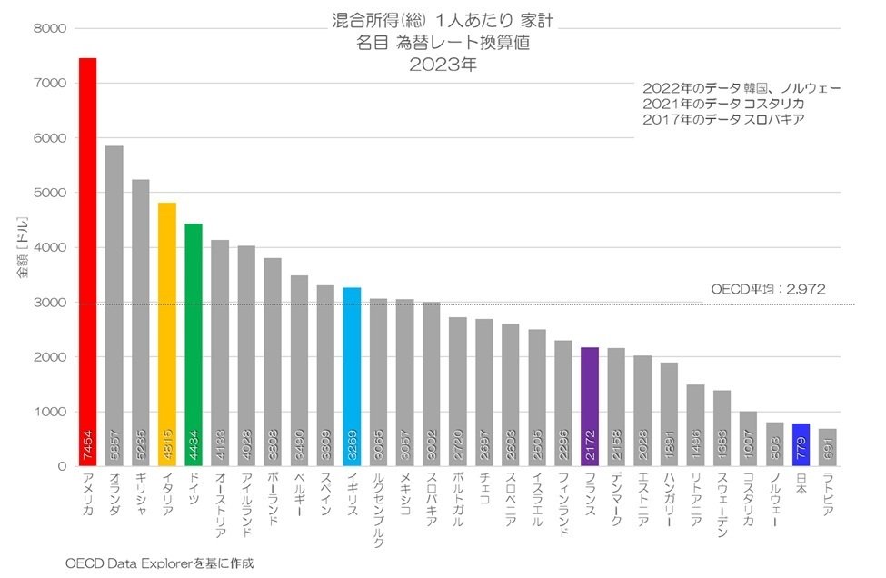 この記事では、個人事業主の所得となる混合所得(総)の国際比較した結果を共有します。