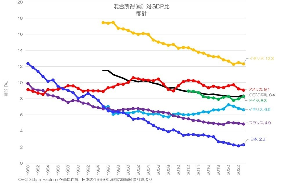 ドイツは営業余剰は非常に低い水準でしたが、混合所得ではイギリスやフランスを上回りOECDの平均程度の水準のようです。