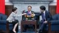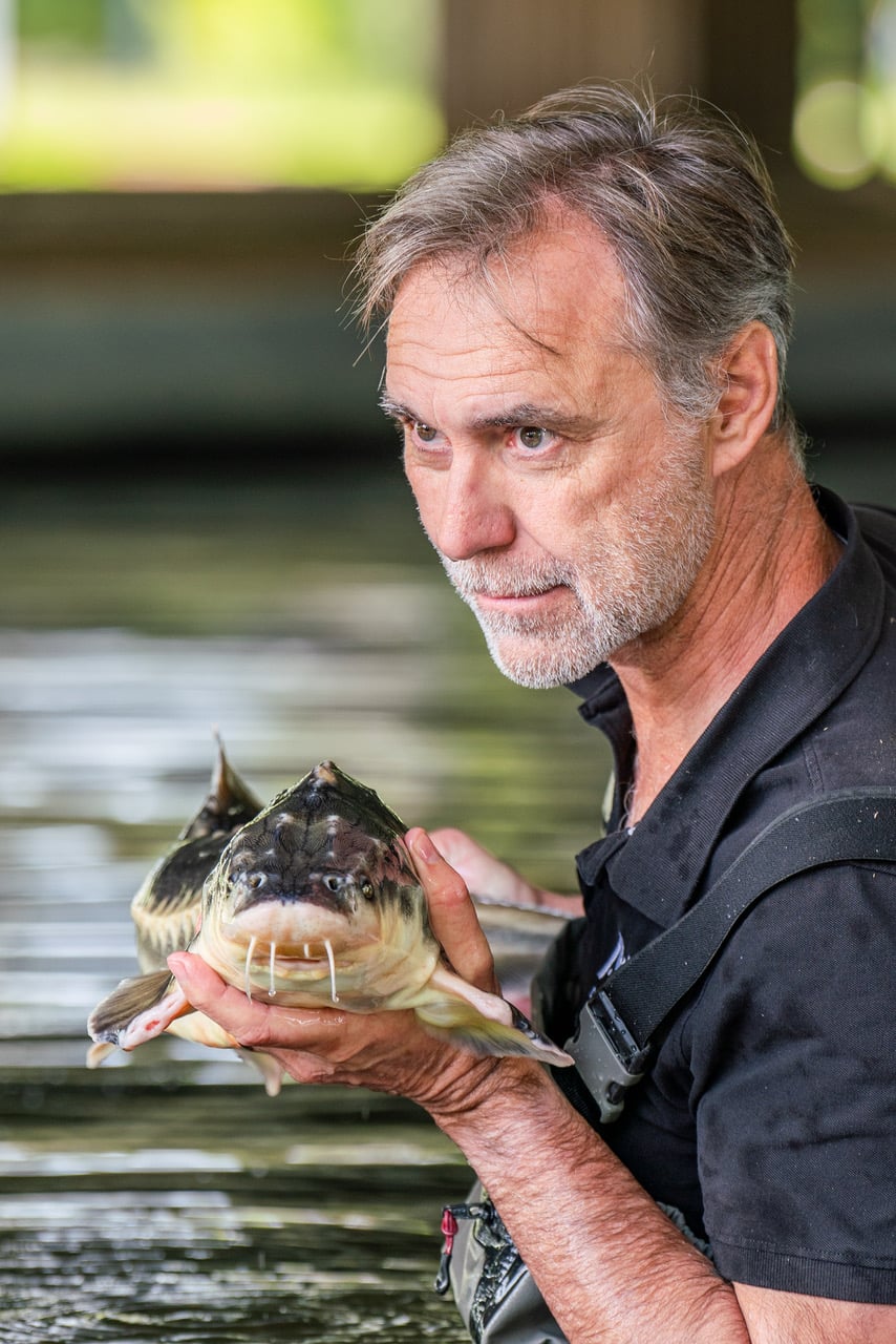 養殖するチョウザメを持つ、オーナーのローラン・ドゥヴェルランジュ氏