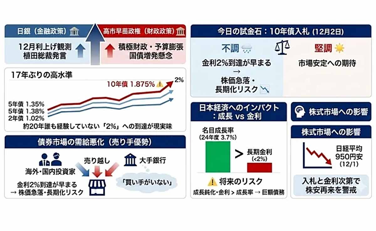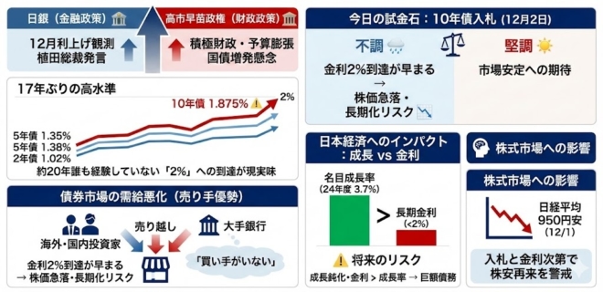 しかし国債の買い手はなく、長期金利は1.8%台に乗り、リーマンショック以来の水準になった。この直接の原因は日銀の植田総裁が今月の金融政策決定会合で政策金利を0.75%に上げるとほのめかしたことだが高市政権が補正予算で11兆円の国債発行を決め、需給が悪化した影響も大きい。