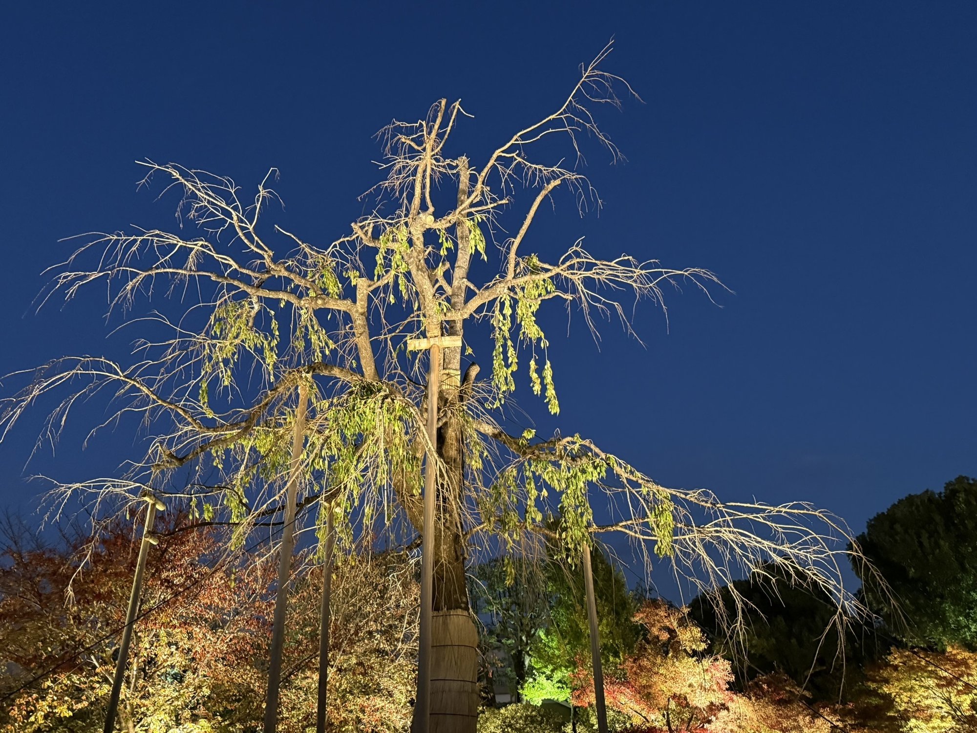 平成18年に三重県から移植されたシダレザクラの不二桜。今はもちろん枝だけですが、それでもライトアップされるとどこか厳かに見えます。