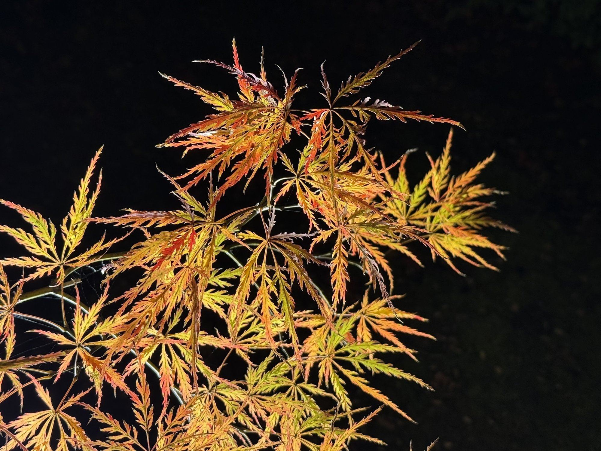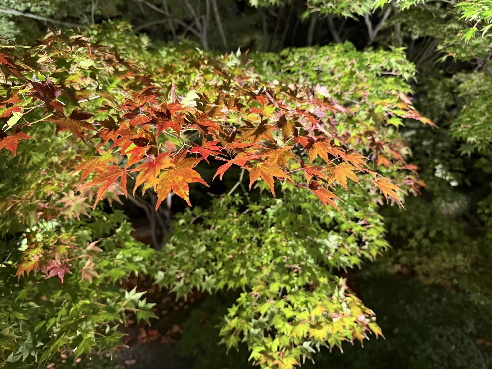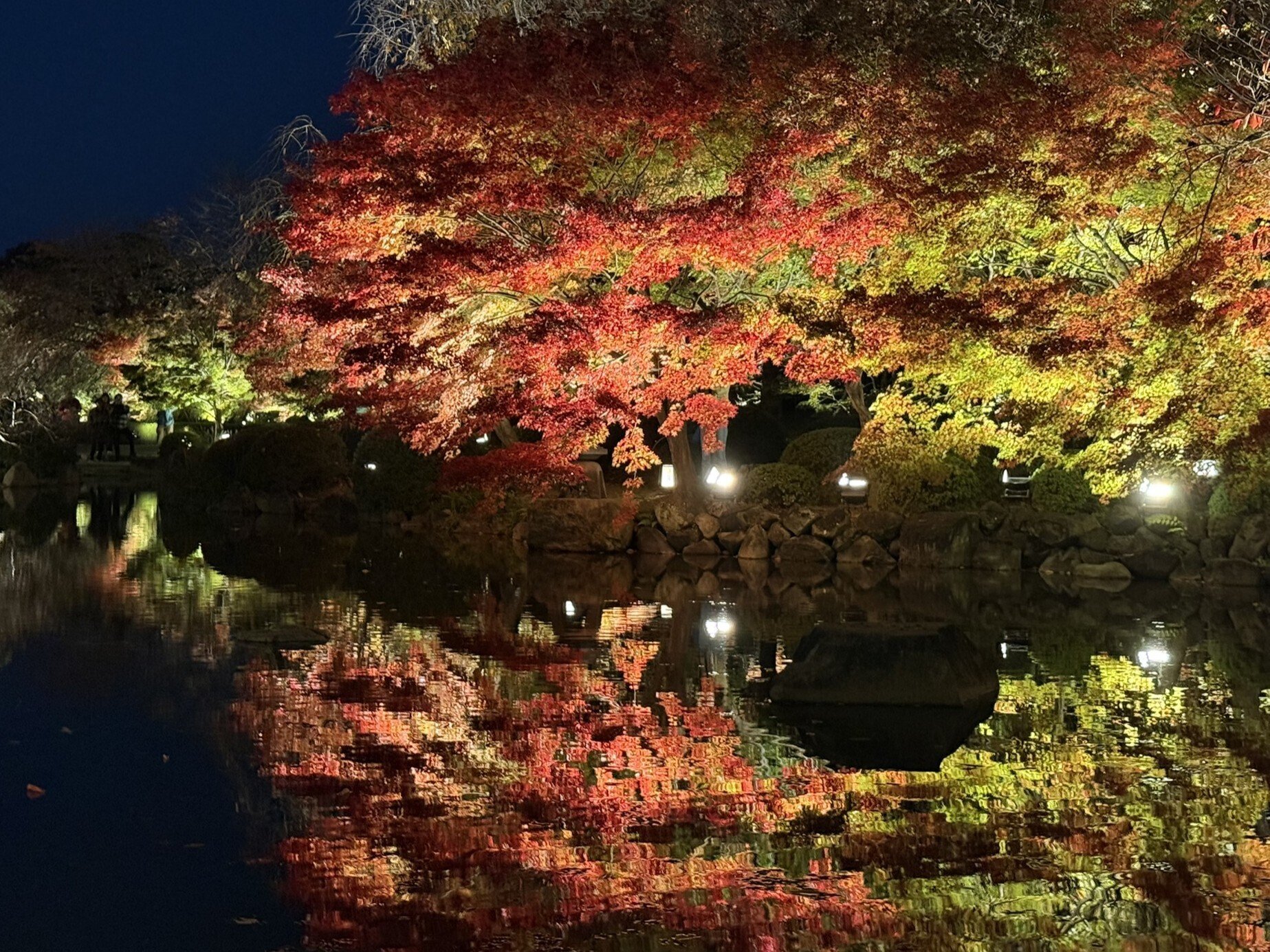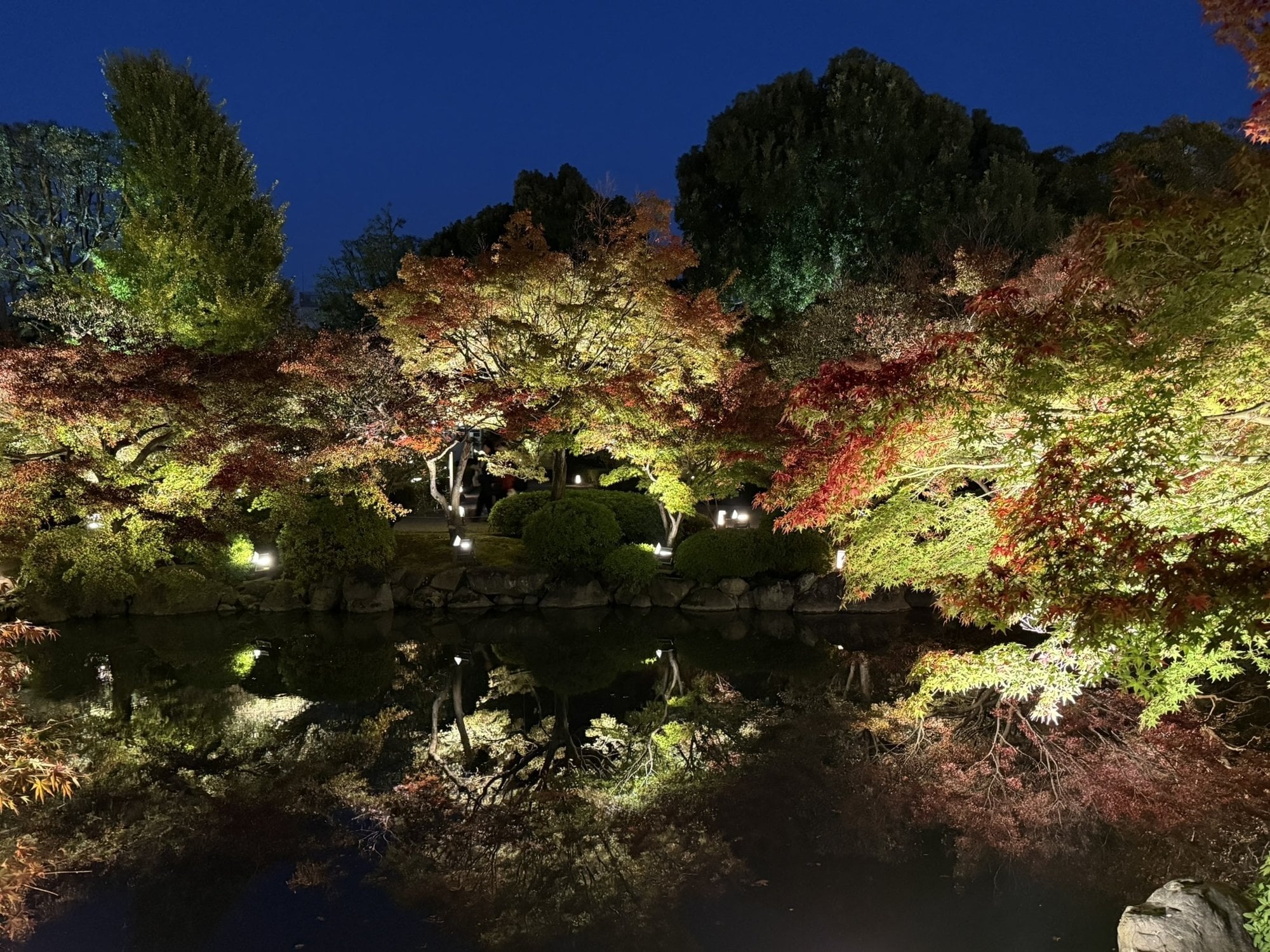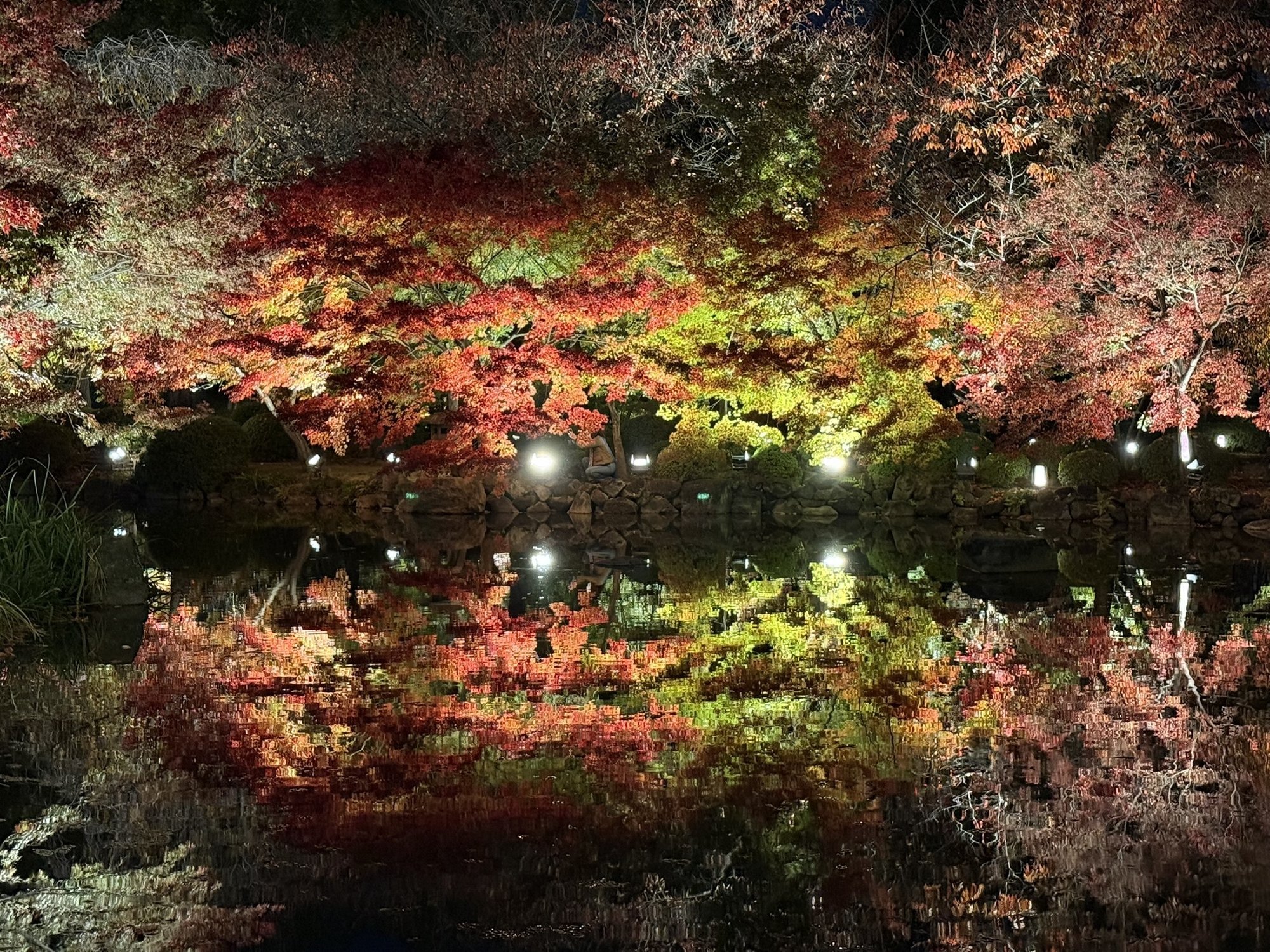 昼間の紅葉見物はたくさんしてきたのですが、夜の紅葉はあまり見ることがありませんでした。光に彩られた紅の景色もまた違った魅力があって美しいと思いました。