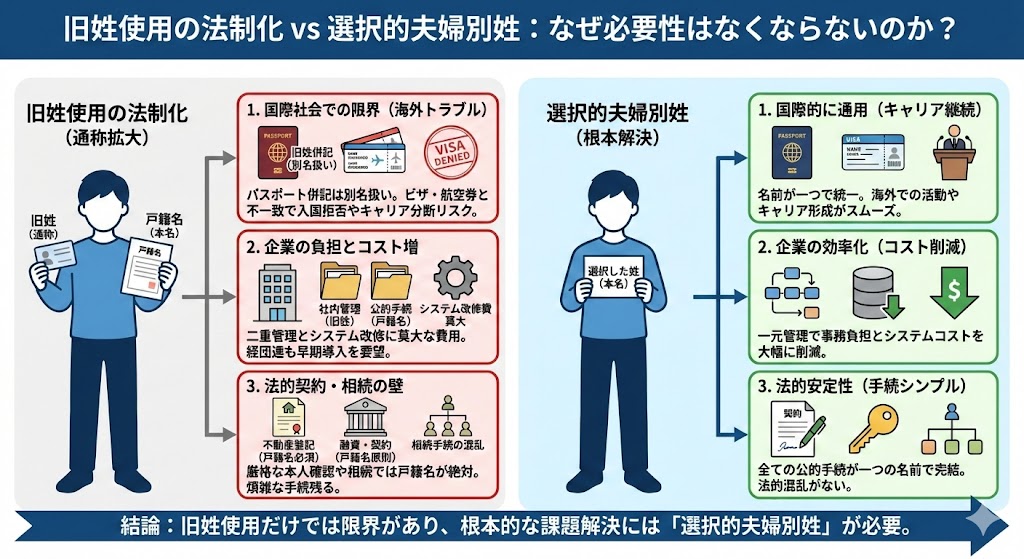 最も安全なのは選択的夫婦別姓(本名は1人につき1つ)という国際標準モデルであり、旧姓法制化はその“つなぎ”としての暫定策にとどまる。