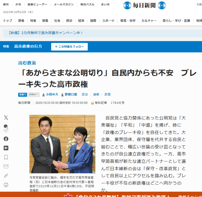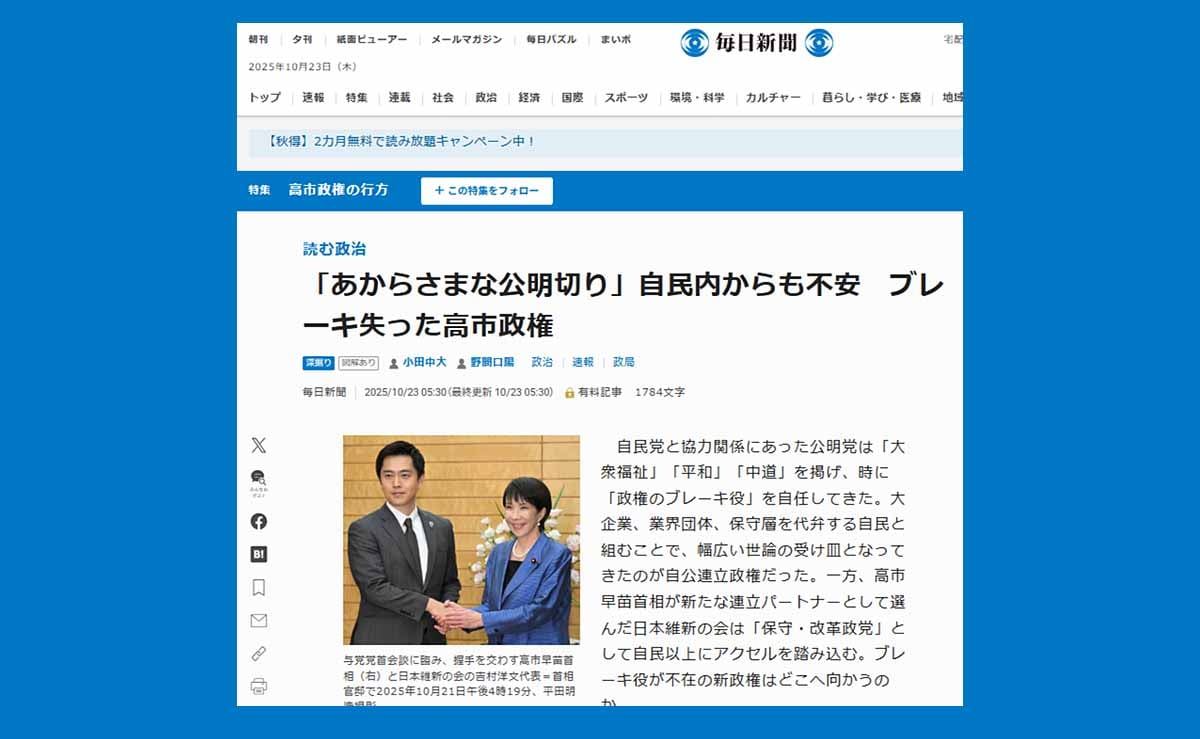 ※トップ画像は高市総理が公明党を追い出したかのように捏造した毎日新聞
