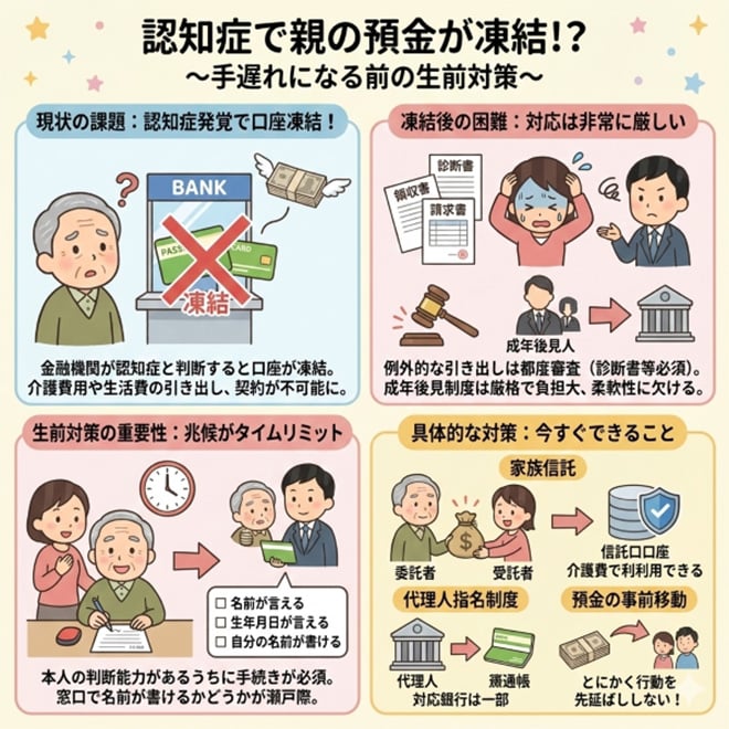 それは、認知症であると金融機関が認めると、親の預金口座が「凍結」されてしまうという問題です。