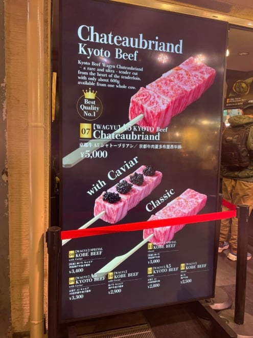 シャトーブリアンの串が一本5000円というインバウンド価格で売られています(写真)。キャビアをのせた牛串もあって、日本人はまず買わないような価格とクオリティです。