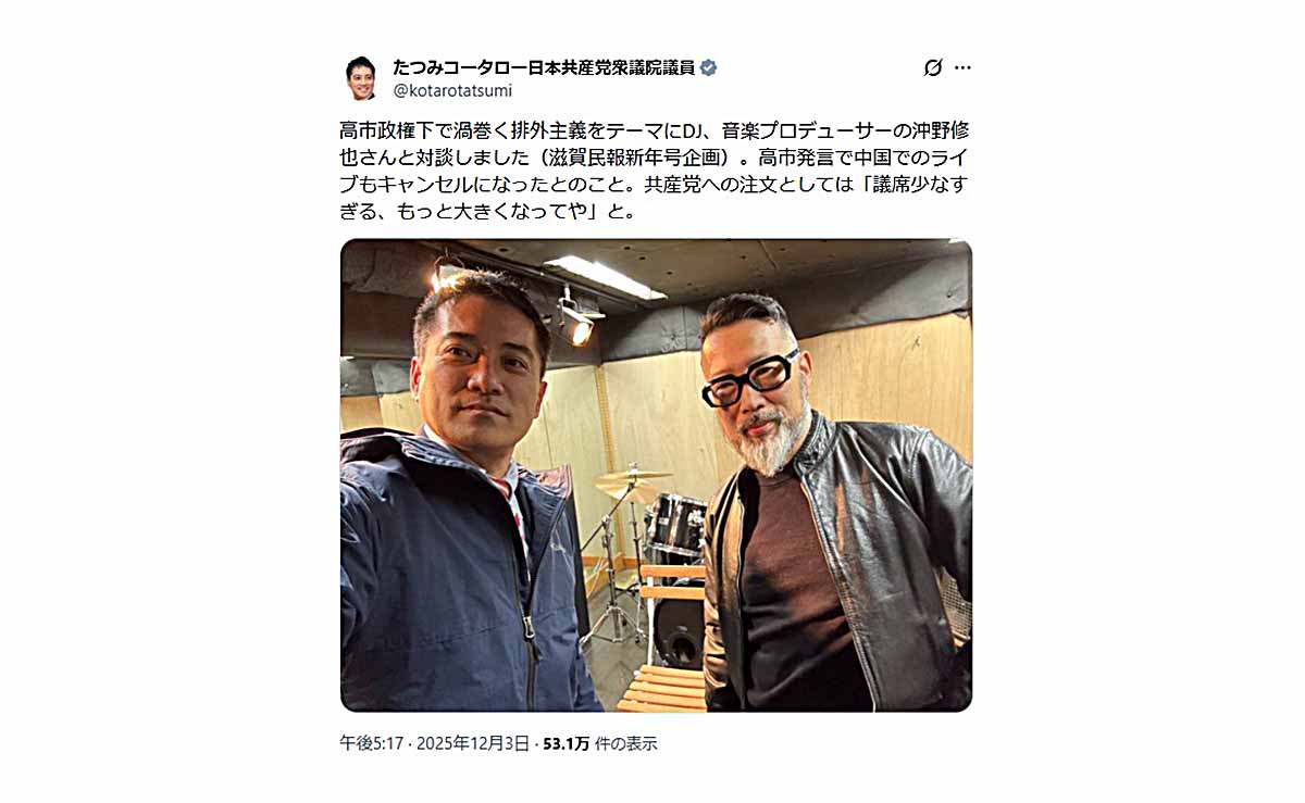 12月4日、自身のXを更新し、アーティストの海外展開を政府として後押しする考えを示した高市早苗首相。日本人アーティストの中国公演が相次いで中止になっている現状を受けての決意表明と思われるが、高市氏はさらに