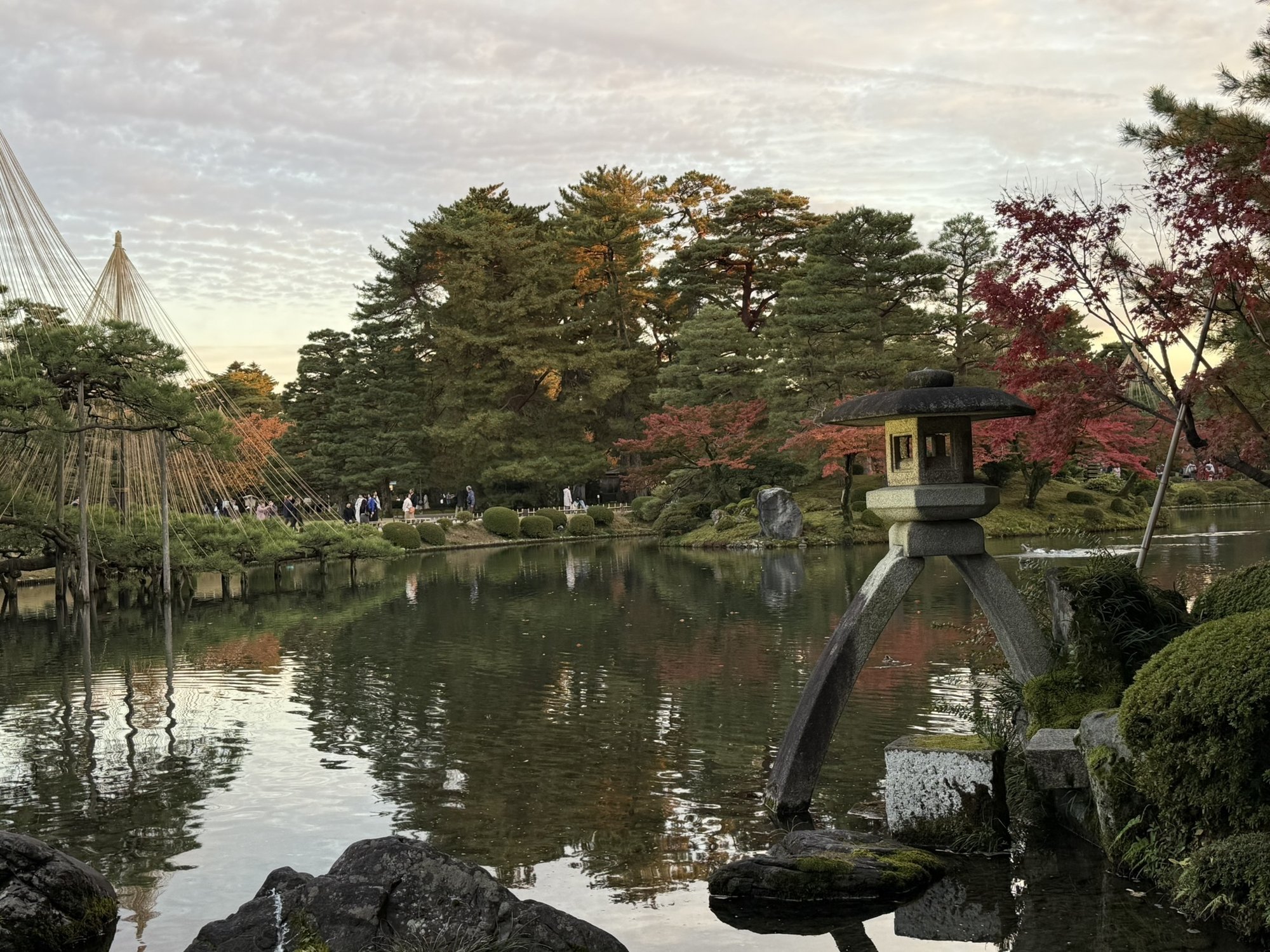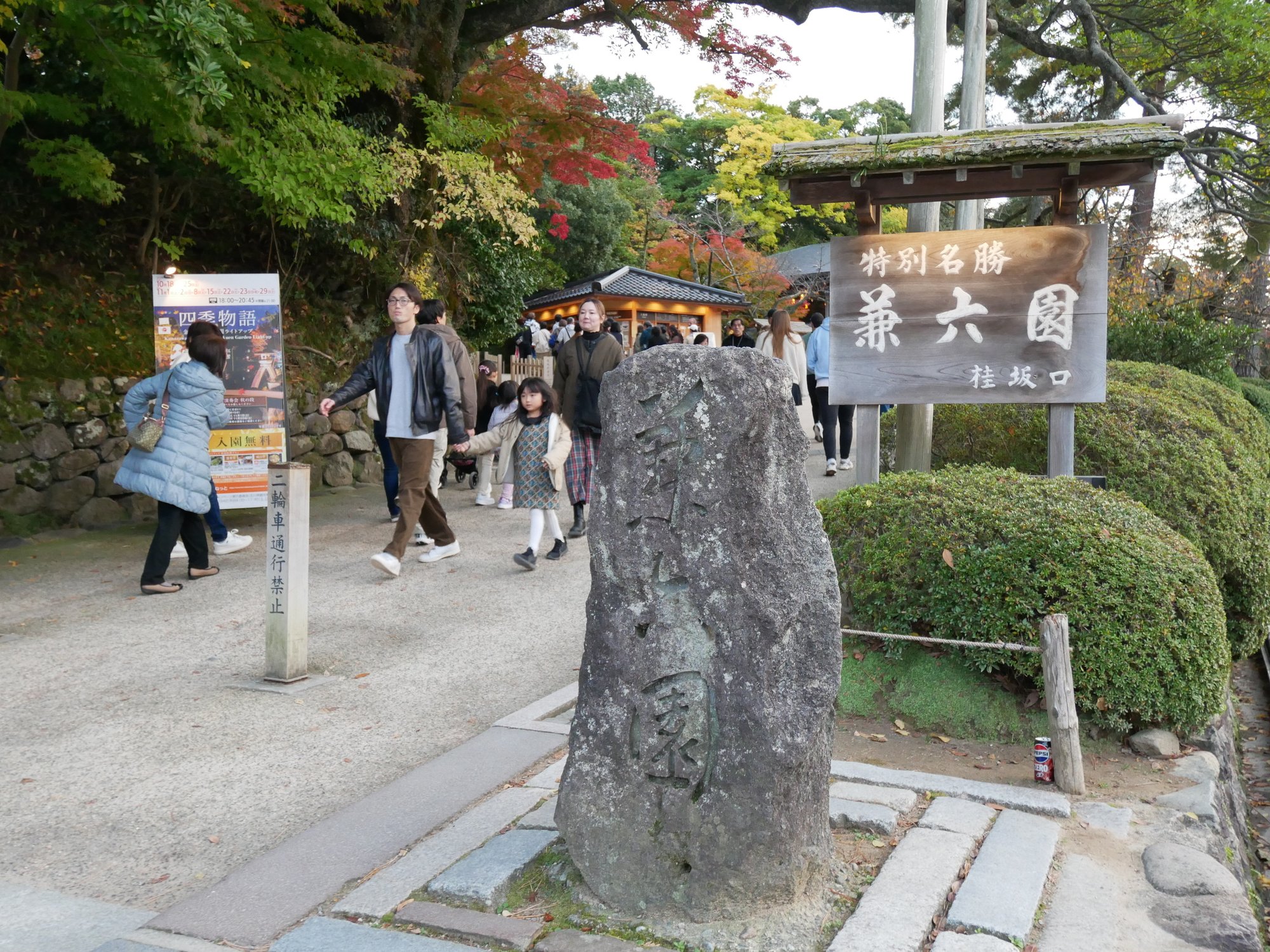 金沢観光といえば、真っ先に名の上がる「兼六園」。旅行にあまり興味がない方でも兼六園は知っている方が多い全国でも指折りの観光名所です。岡山の後楽園、水戸の偕楽園とともに日本三大庭園に数えられています。さすが有名観光名所、日も傾いてきた時間にもかかわらずインバウンドの観光客でごった返していました。