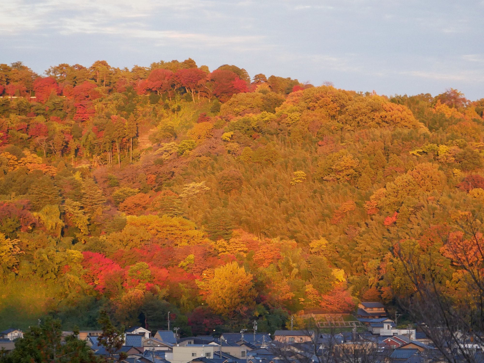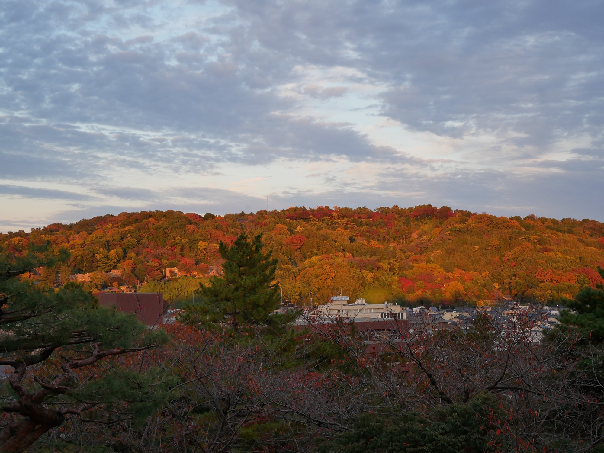 兼六園は金沢城とともに小立野(こだつの)台地の先端部分に築かれていますので、園内から町を一望することができます。時刻はちょうど日暮れ時。東の山々が西日に照らされてとてもきれいでした。もともと山は紅葉で赤くなっていましたがさらに西日の赤が山を燃え上がらせます。