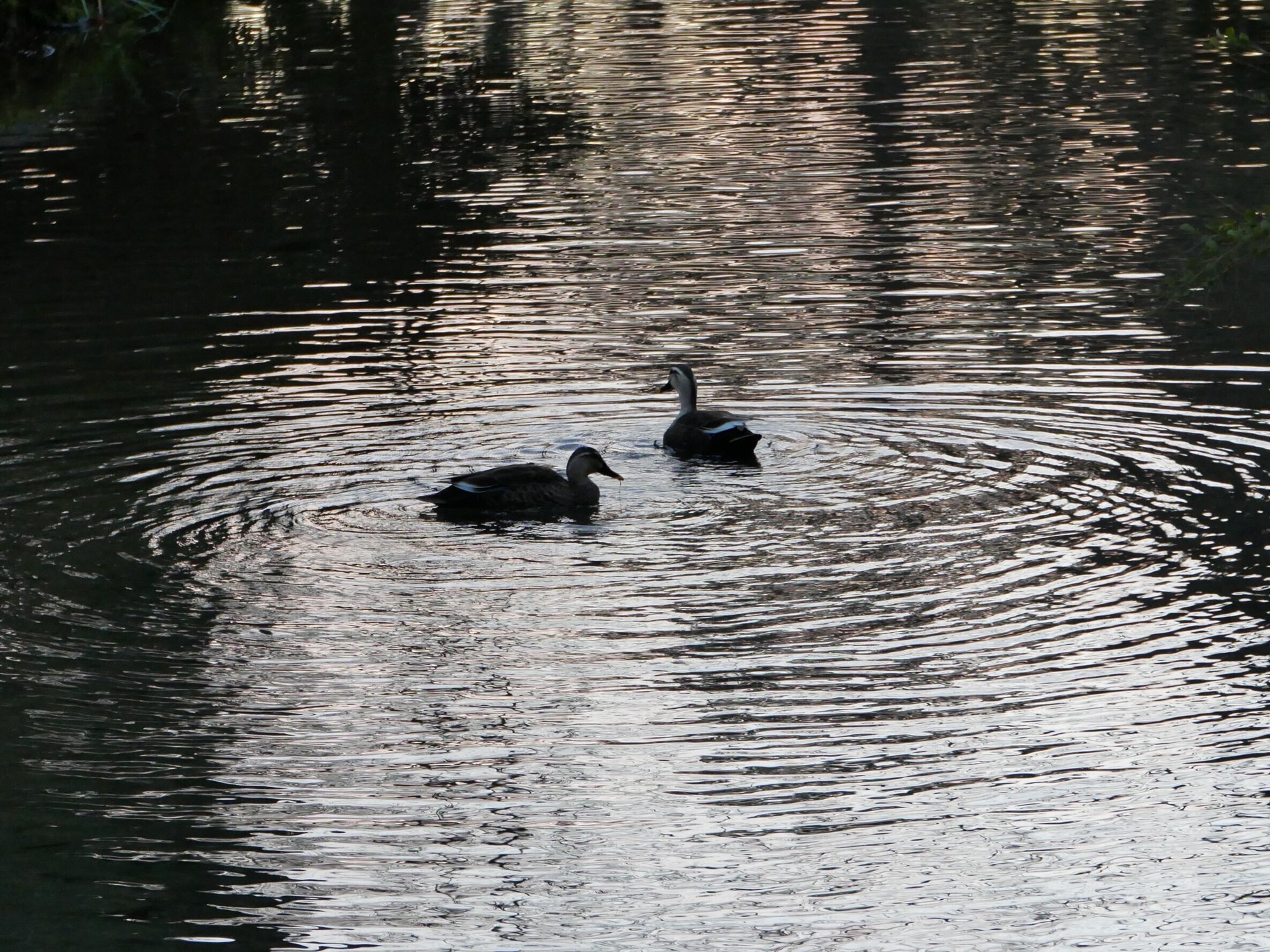 霞が池に水鳥が浮かんでいて羽を休めています。池には真っ赤な紅葉がせり出していて、水鳥がそれを見て楽しんでいるようにも見えます。