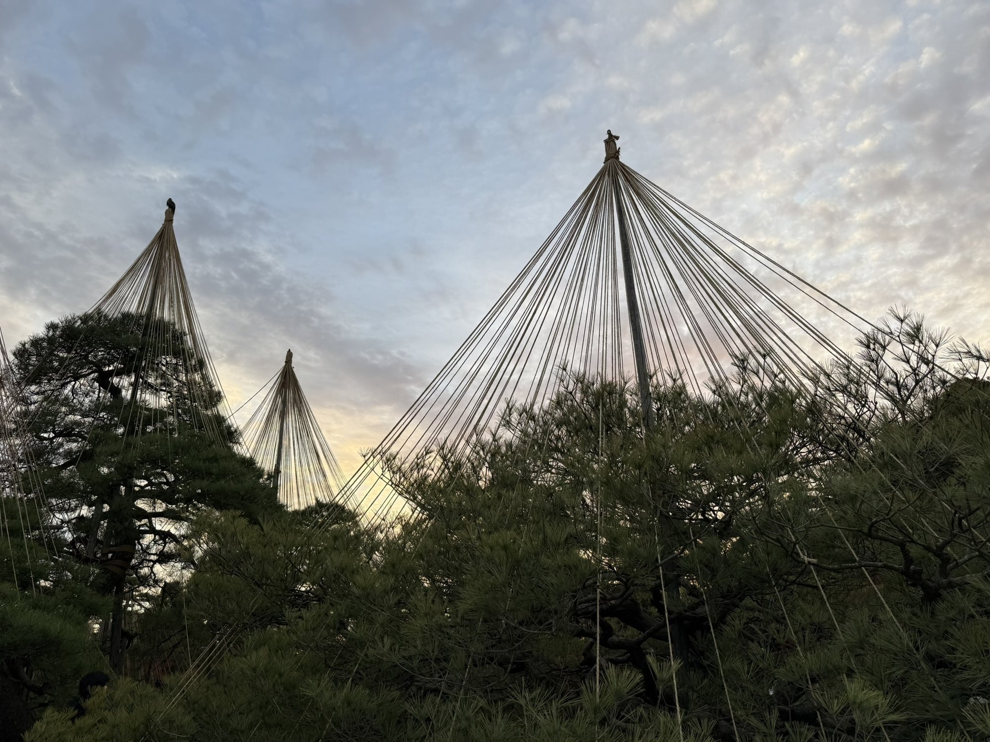 園内は冬に備えて雪つりも施されていました。兼六園を始め、雪国の庭園ではよく見られる冬の風物詩です。