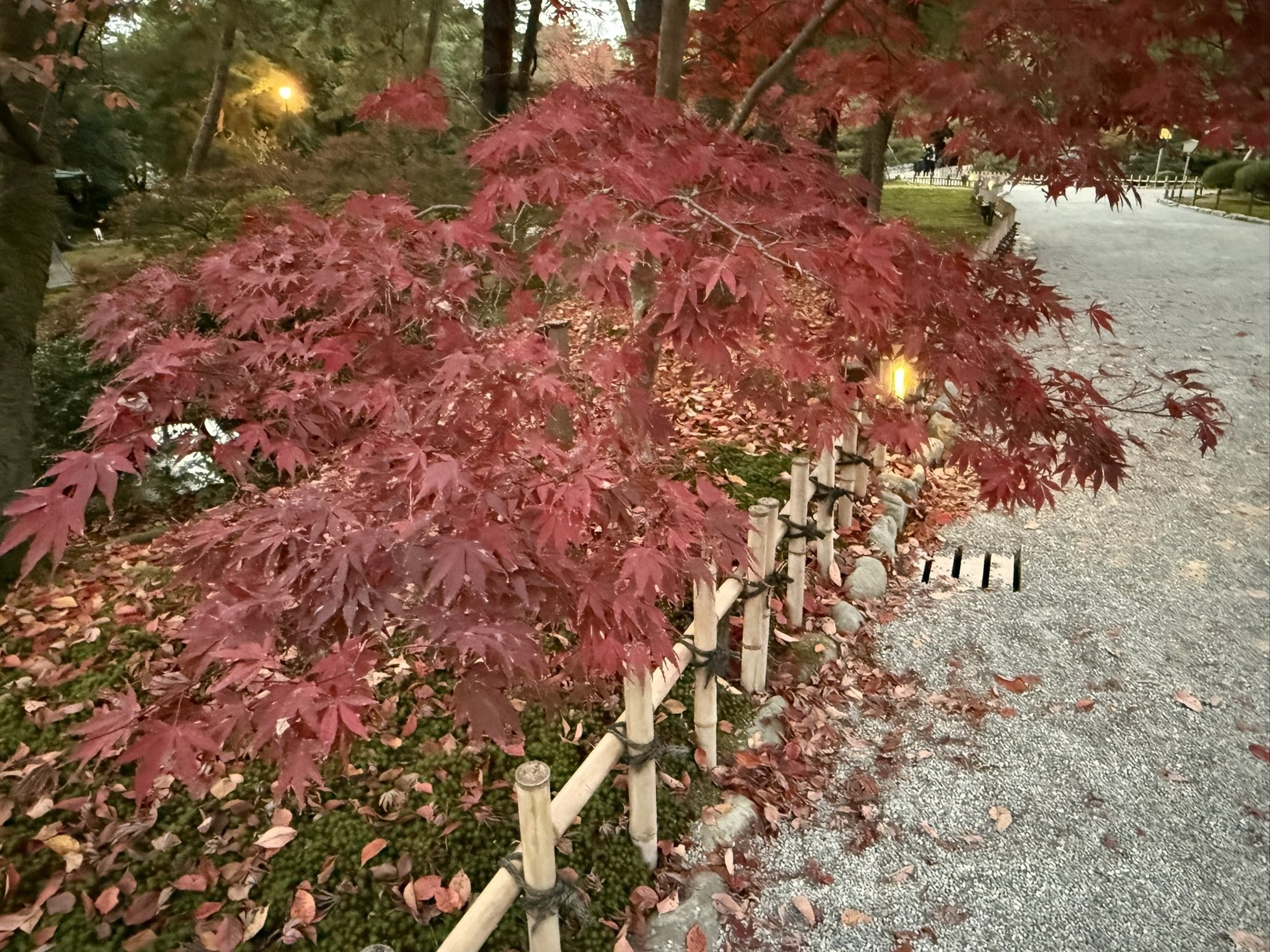 日が落ちてきて徐々に暗くなってきました。園内の灯籠にも灯りがともりだします。ここから機材をiPhoneに切り替えました。辺りは暗くなってきましたが、補正でまだ紅葉を明るく撮ることができます。