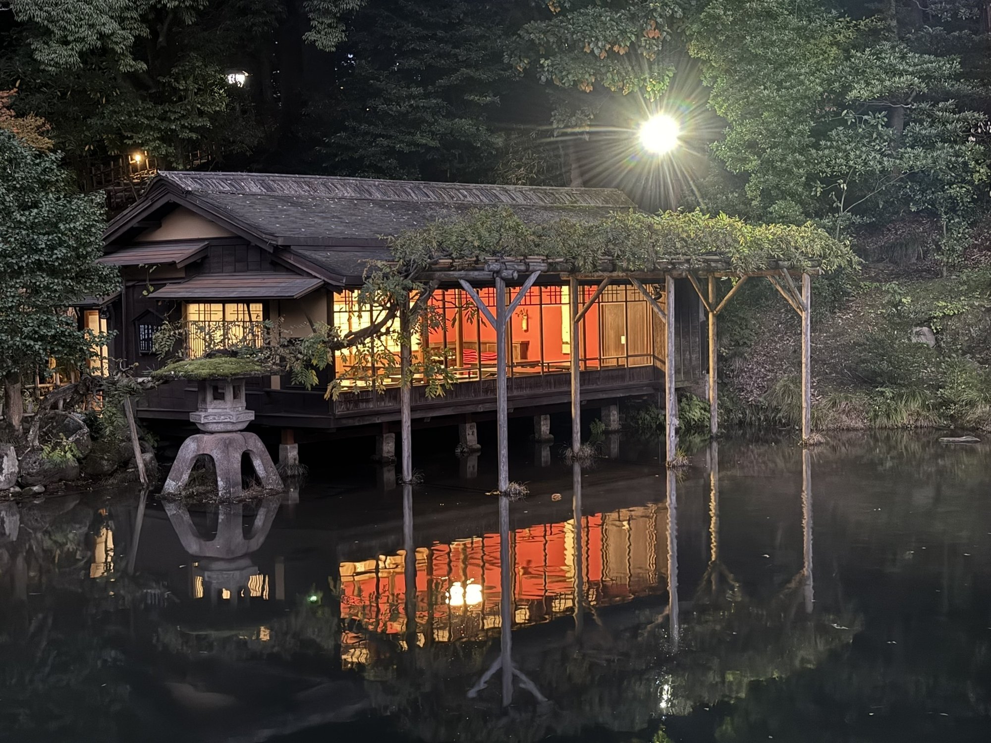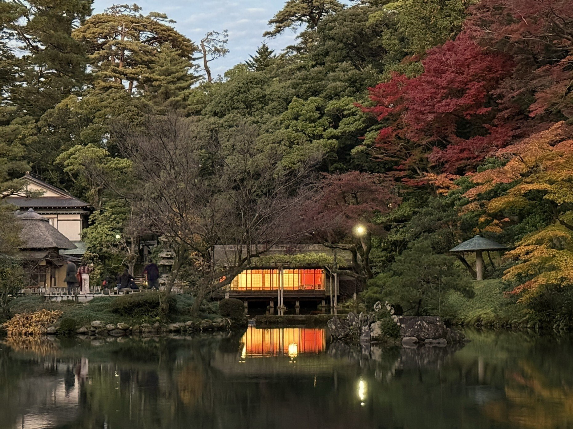 17時を過ぎ、園内の建物にも灯りがともりだしてきました。瓢箪型の瓢池の畔(ほとり)に浮かぶ夕顔亭。240年前に建てられた茶室は兼六園に残る建物の中で最古のものです。橙の暖かな灯りがとても柔らかで美しいですね。