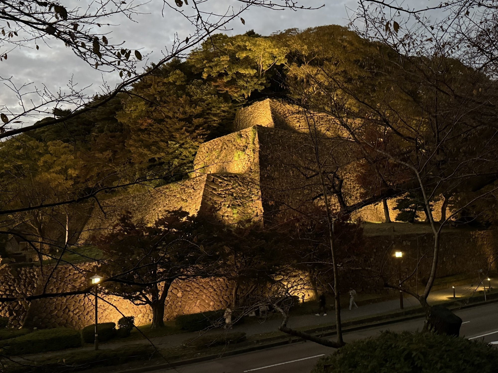 夕暮れの兼六園を出れば向かいの金沢城の石垣がライトアップされていて、とても幻想的な光景を見せてくれていました。何段にも重なった高い城壁は、まるで西洋の城の城壁のようです。