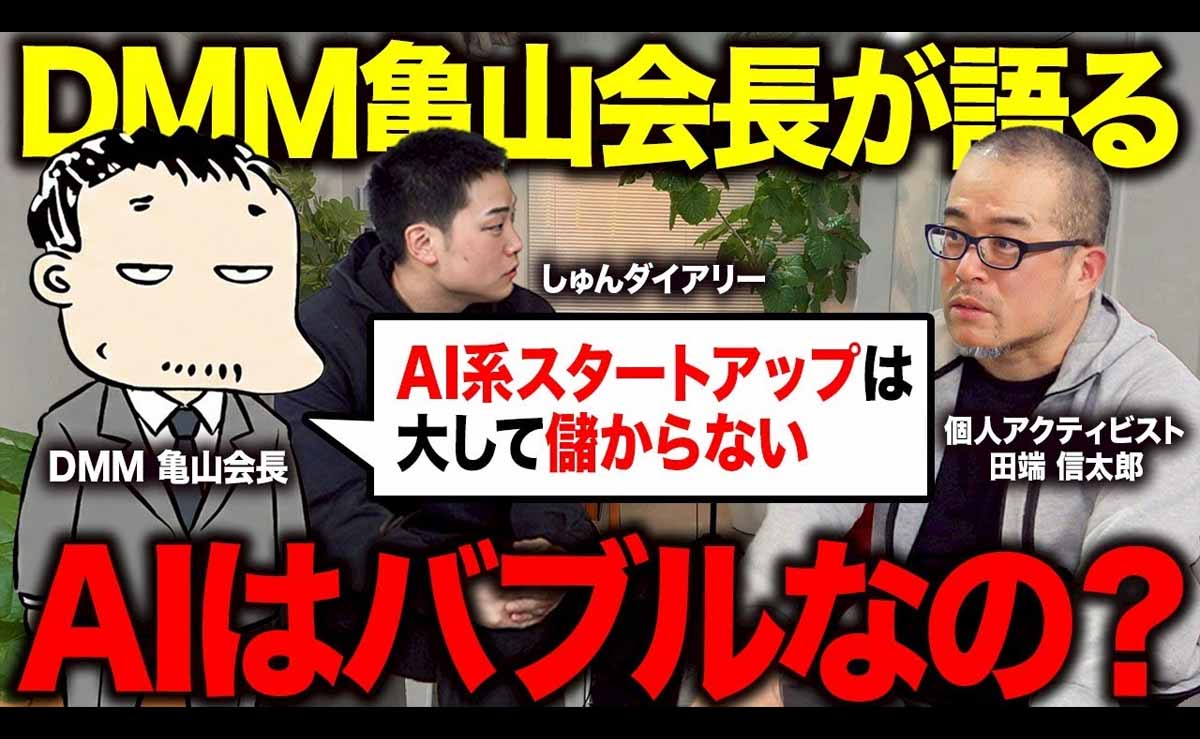 DMM亀山会長が語る「AIはバブルなの?」 田端 信太郎 2025.12.20 06:10 Twitter Facebook はてブ Pocket LINE 経済 DMMの亀山会長が田端信太郎氏との対談で、AI単体での収益化は難しいが既存事業への導入による効率化や格差拡大は確実であるという持論を語り、かつて田端氏に「年収10億円」を提示して勧誘した裏話や自身の経営哲学についても明かします。 ■ 著名な実業家であり、経営者、マーケティングのエキスパートとして広く知られる田端信太郎氏のYouTubeチャンネル「田端大学 投資学部」。コツコツ積立だけでは満足できない!周囲を出し抜く!そんな株の醍醐味を味わいたい方へ。「田端信太郎の株道場」入会はこちらから。 「ピェンロー鍋」はなぜ美味しいのか? 日銀が0.75%に利上げでも円安加速:円安スパイラルはこれからが本番か