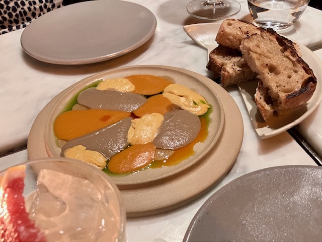 柑橘の香りが素敵なカクテルで乾杯し、トマトベースのソース”ホガオ”、茄子ピュレ、ピピアン、3種のソース&トースト。どれもまろやかで優しい味でいい。パンを食べすぎちゃう。