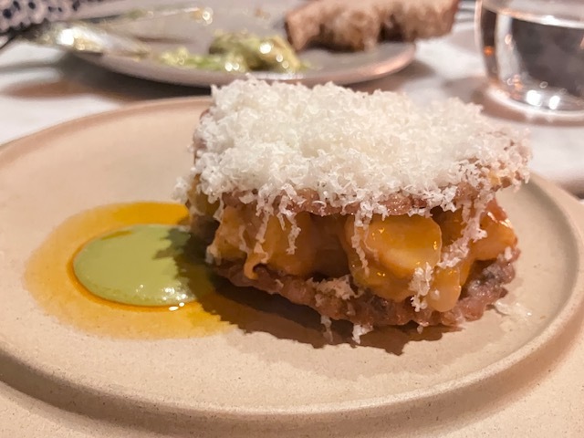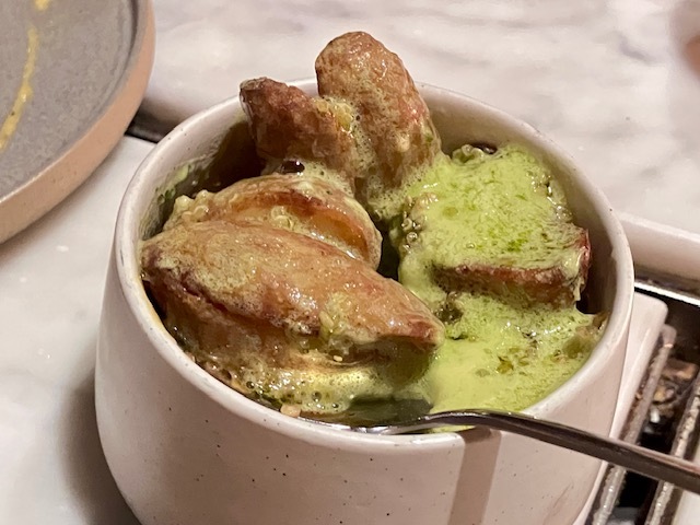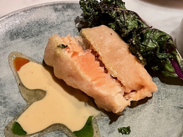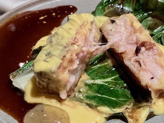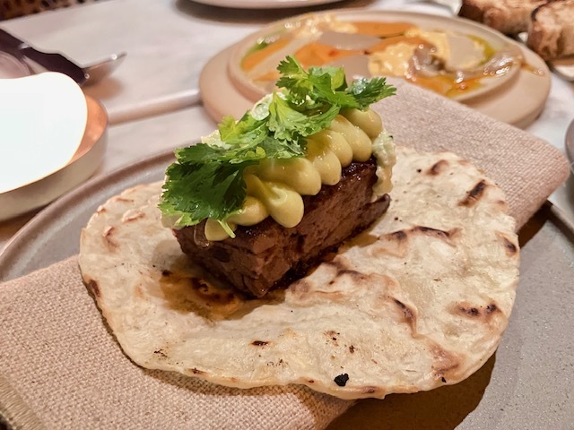 マニョックで作ったタコスに包んだほろほろ牛肉&アヴォカド、カフェやとうもろこしと合わせた子豚のコンフィ、燻製じゃがいも&チミチュリ。いい塩梅の南米風味。マスのフリッターはパッションフルーツのブールブランと。