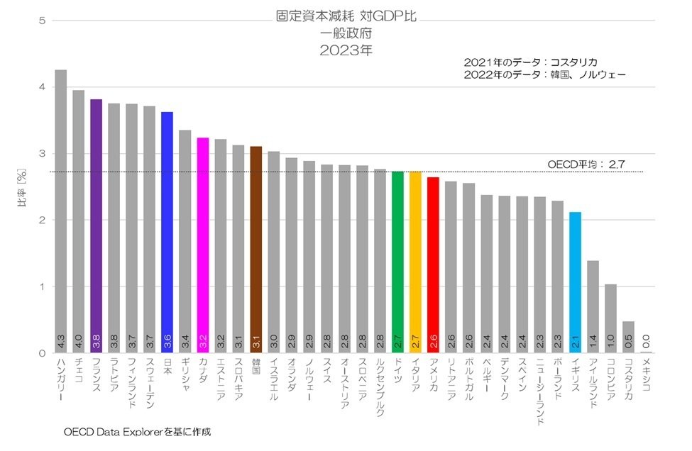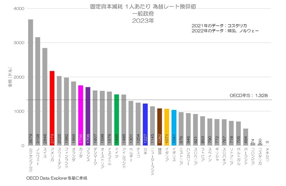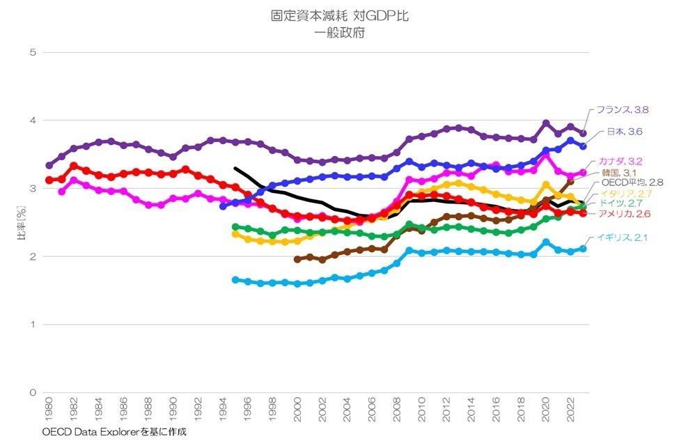 いわゆる公共投資が相対的に多かった事もあり、蓄積した政府の固定資産が多く、その償却費用も多いという解釈ができそうです。