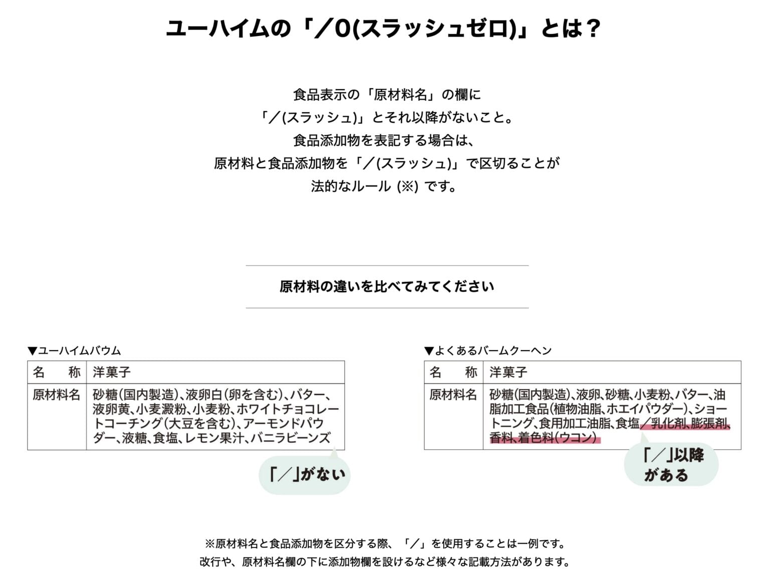下の図は、同社ホームページに掲載されている情報です。このように、食品表示の「原材料名」の欄には、食品添加物が「/スラッシュ」以降に書かれています。多くのバームクーヘンには添加物が書かれています。でもユーハイムには添加物が一切ありません。まさにユーハイムしかできない独自性です。