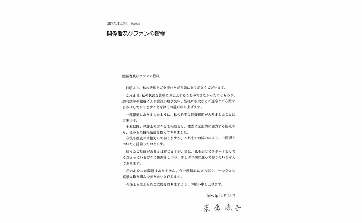 【完全版】米倉涼子(50)2時間半のガサ入れで複数の薬物・器具が押収された!《麻薬取締法違反容疑で本格捜査》 #週刊文春 https://t.co/aGay4UHOW7— 週刊文春 (@shukan_bunshun) December 26, 2025