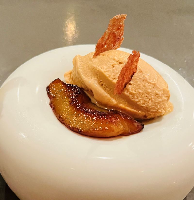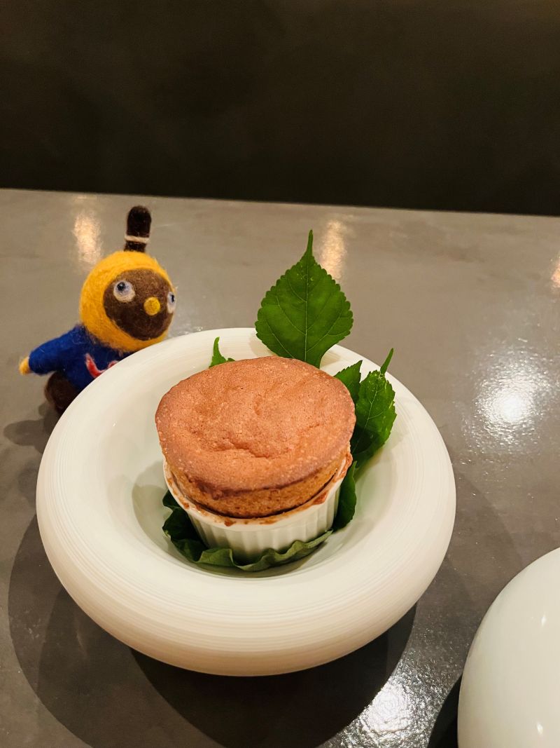 熱々のスフレに添えられていたのは、冷たいヘーゼルナッツのアイスと、キャラメリゼされた洋梨のコンポート。コンポートは貴醸酒を使用しているそう。