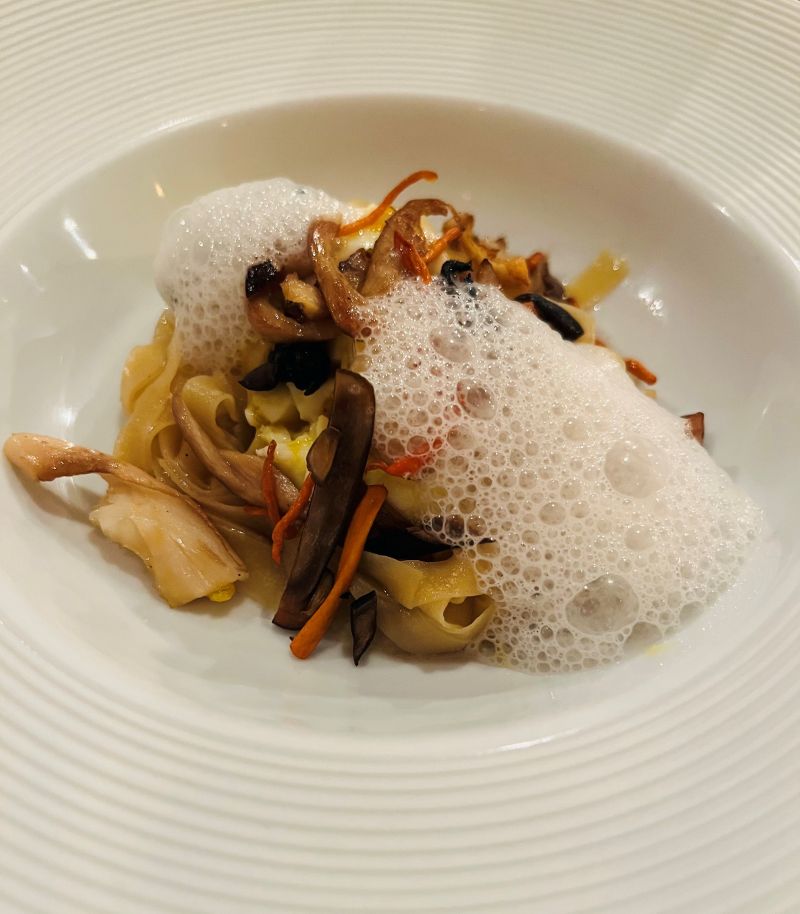 手打ちのタリアッテレは、カウンターの前で準備して、出来たてを茹でて提供されます。季節の天然キノコとの相性もよく、つるりと心地よく、いつの間にかお腹に収まっていました。