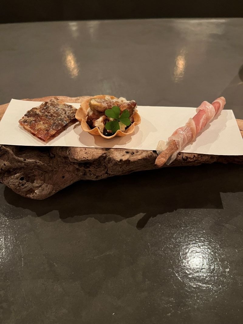 アミューズは、イチジクと自家製青カビチーズのタルト、生ハムと実山椒のグリッシーニを含む三種。さりげないのに、これから始まる時間への期待を、そっと整えてくれるような一皿です。