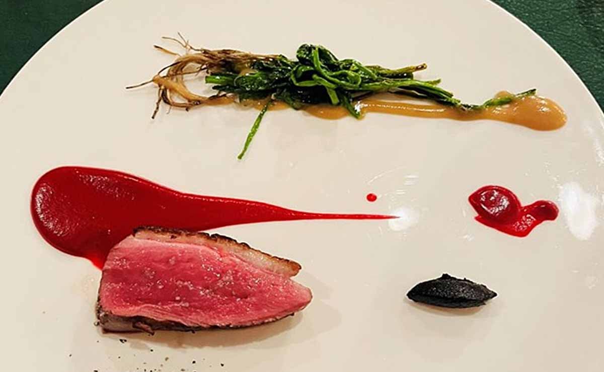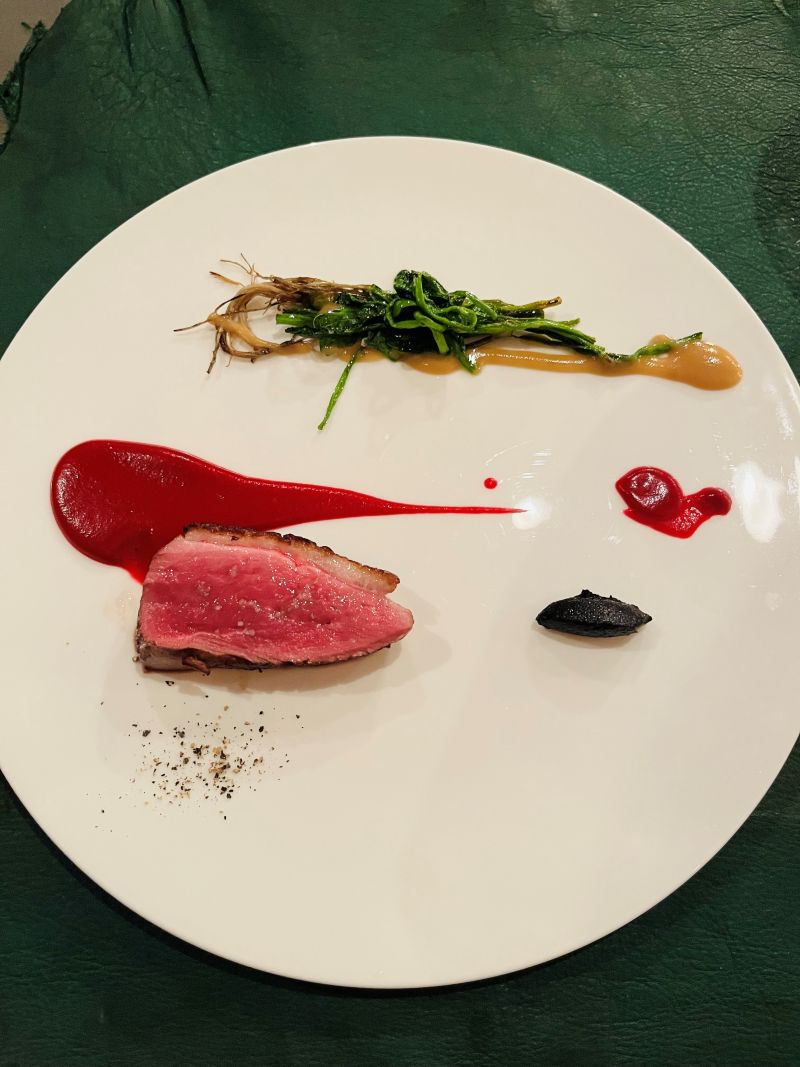 かすみ鴨とビーツのボリートに自家製の黒ニンニク、セリ、自家製の鹿の醤油ソースを添えて。