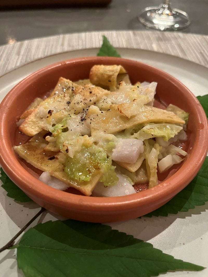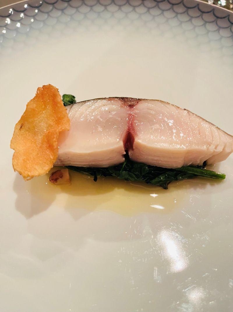 寒鰆は皮目を焼き上げ、ほうれん草と乳酸発酵させた麹のソースが旨味、菊芋チップスの香ばしさがふわりと広がります。