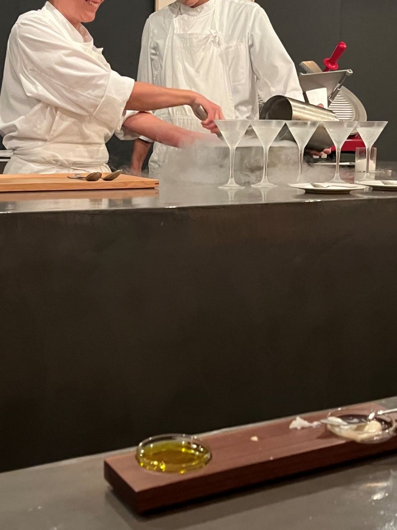 白い気体がもくもくと立ち上り、食卓が一瞬、魔法の時間に変わります。すっきりとした梅のグラニテ。